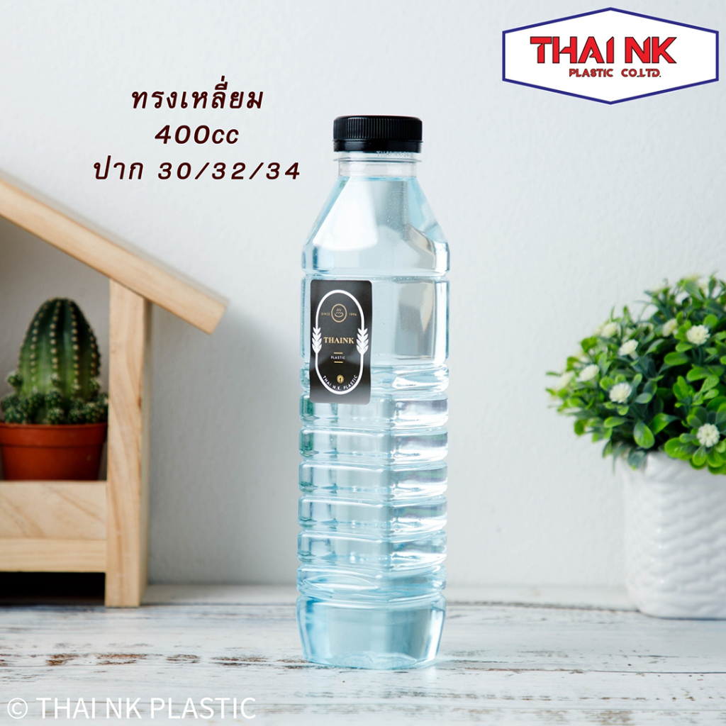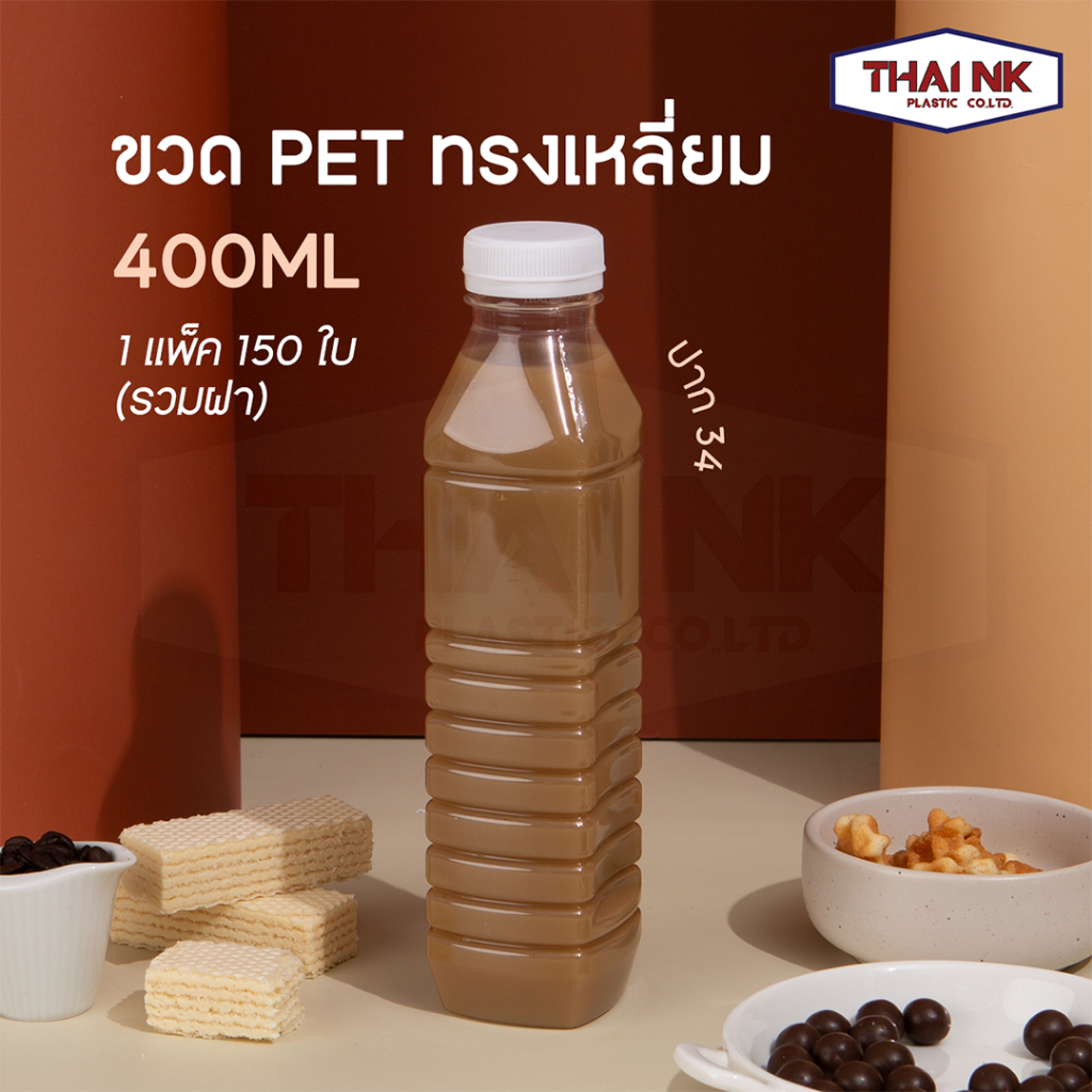 (ถูกที่สุด!) ขวดพลาสติก PET ทรงเหลี่ยม 400cc ปาก34 (1 แพ็ค มี 150 ใบ พร้อมฝา)