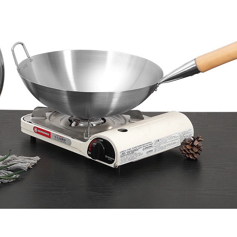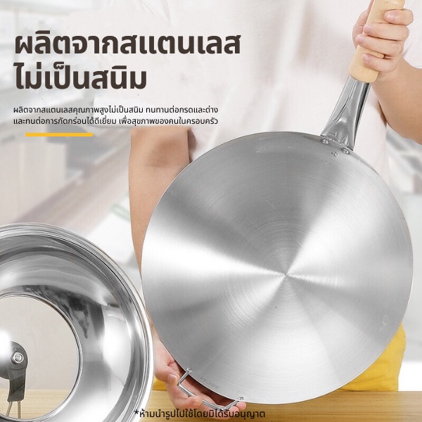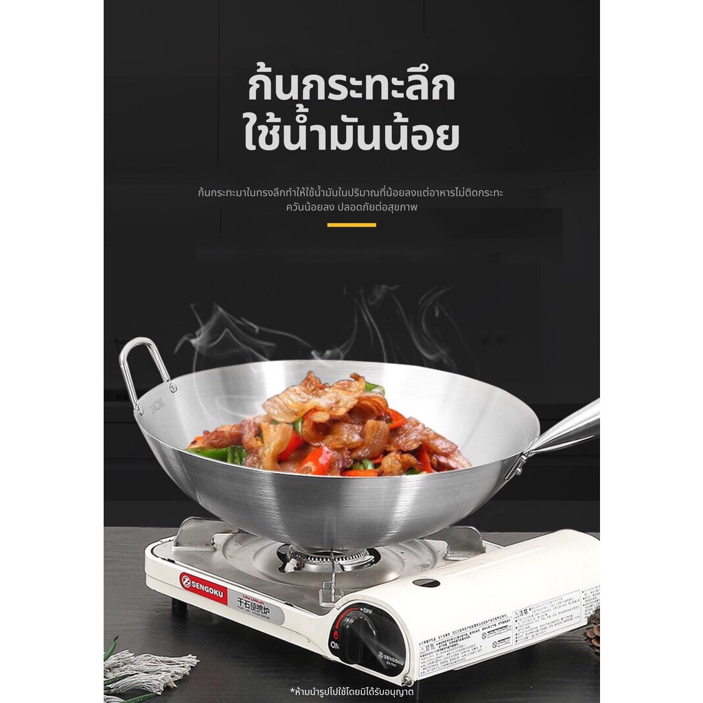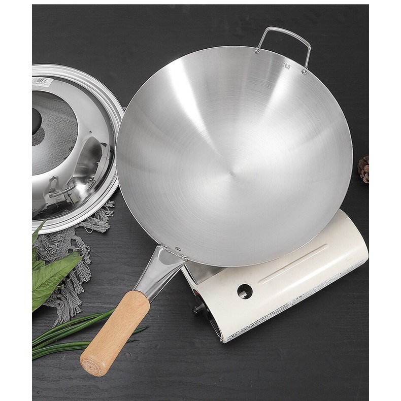 กระทะสแตนเลส ด้ามไม้ ทรงลึก มีหูห้อย ขนาด 28/30/32/34/36/38CM