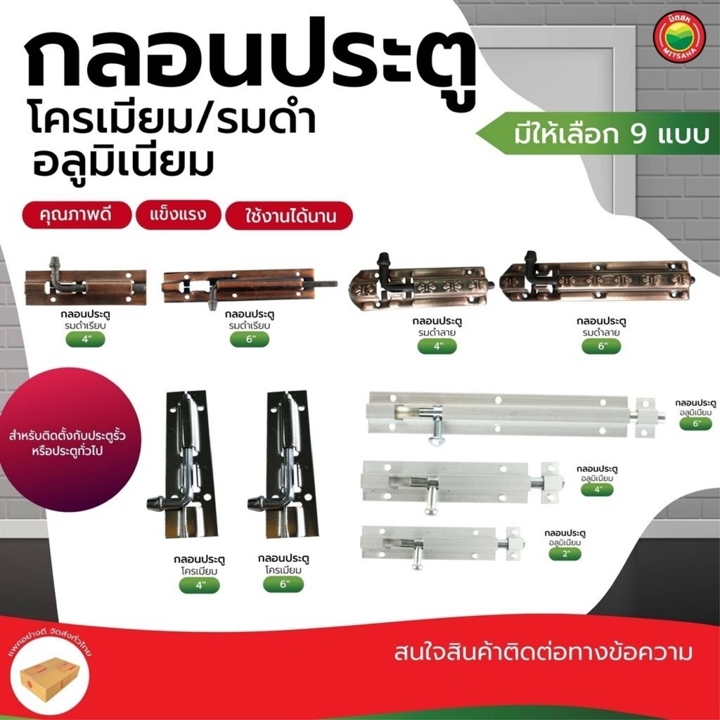กลอน ประตู โครเมียม รมดำ อลูมิเนียม ขนาด 2นิ้ว, 4นิ้ว, 6นิ้ว DOOR BOLT ล็อค หน้าต่าง ประตูรั้ว บานเลื่อน ห้องน้ำ มิตสห