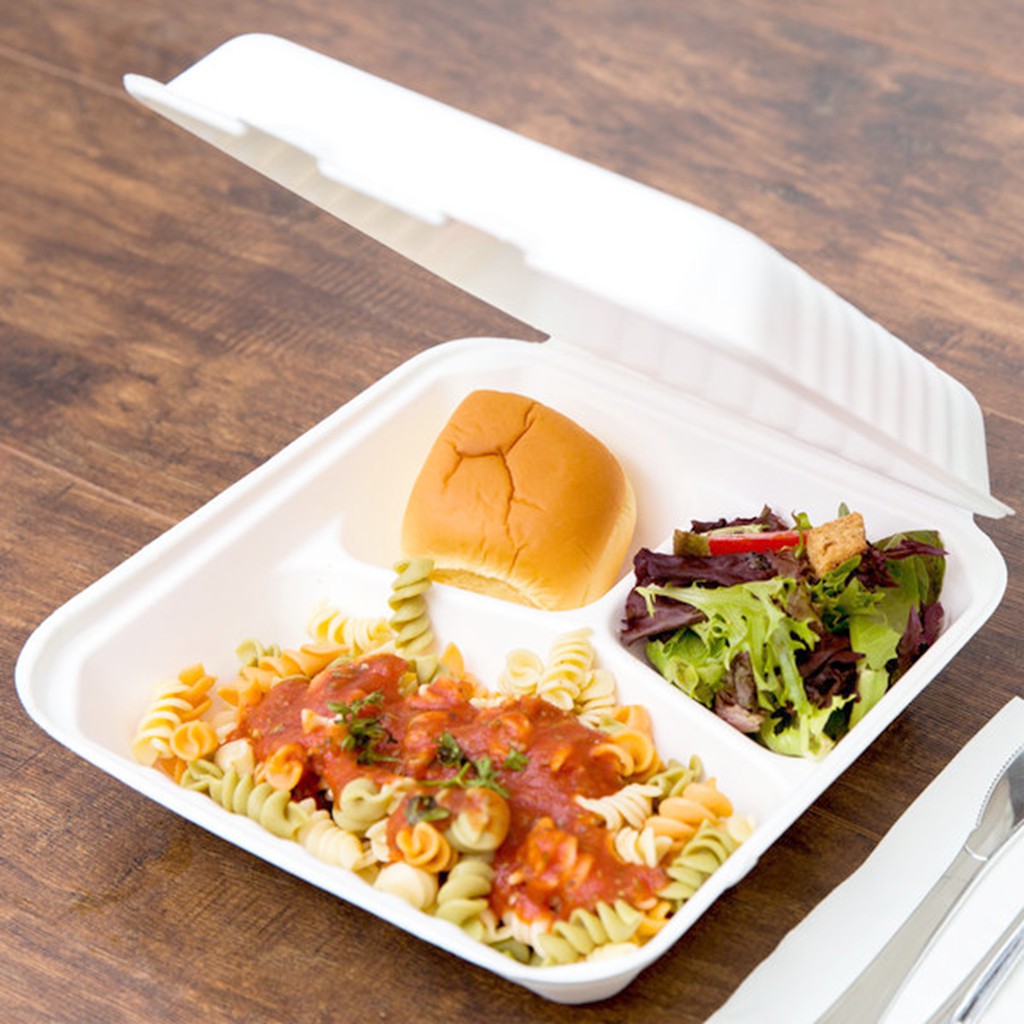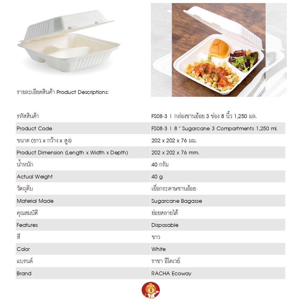 กล่องชานอ้อย 3 ช่อง 8 นิ้ว 1,250 มล. สีขาว [ FS08-3 ] แบรนด์ ราชา Ecoway (50 ชิ้นต่อแพ็ค)