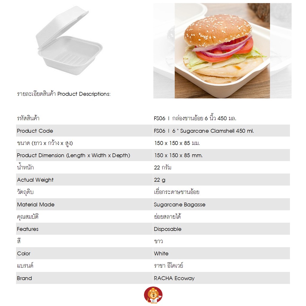กล่องชานอ้อย 6 นิ้ว 450 มล. สีขาว [ FS06 ] แบรนด์ ราชา Ecoway (50 ชิ้นต่อแพ็ค)