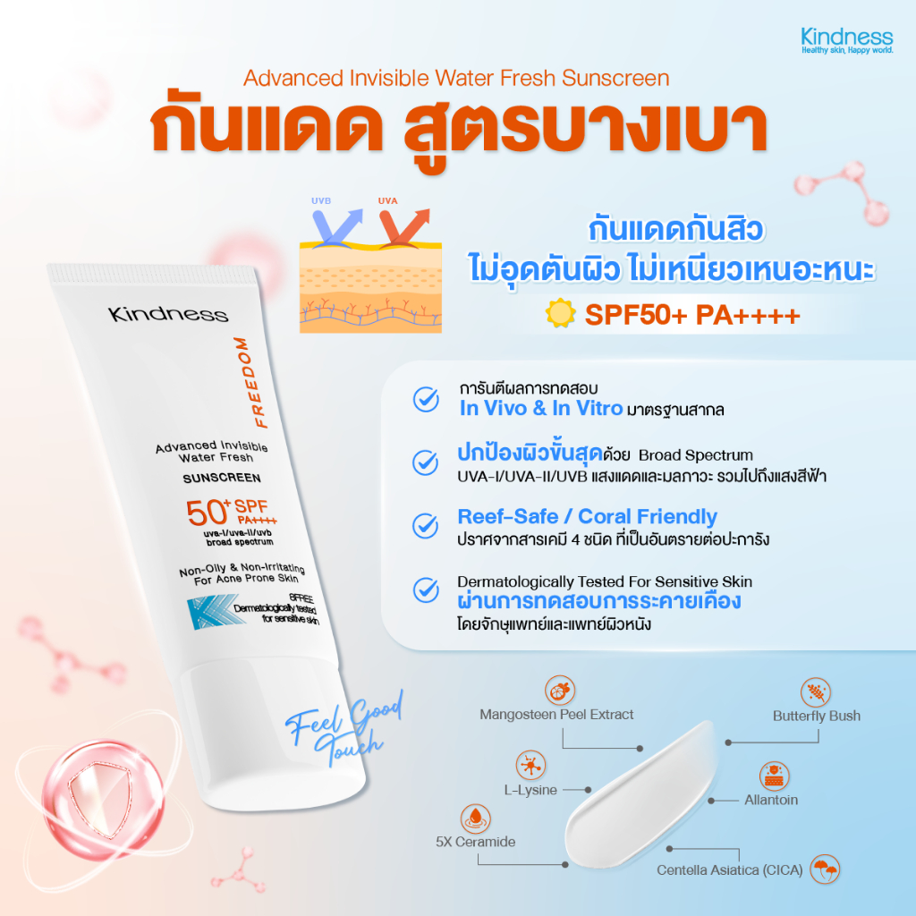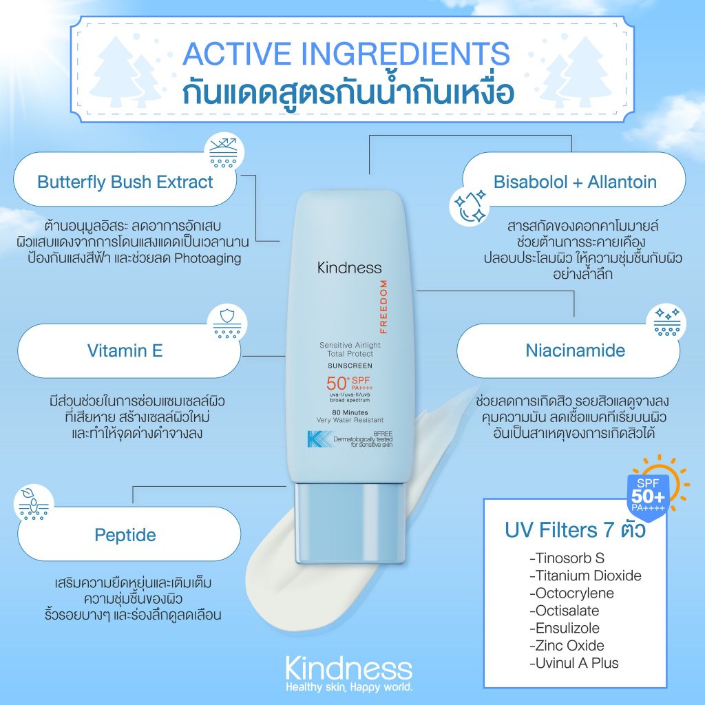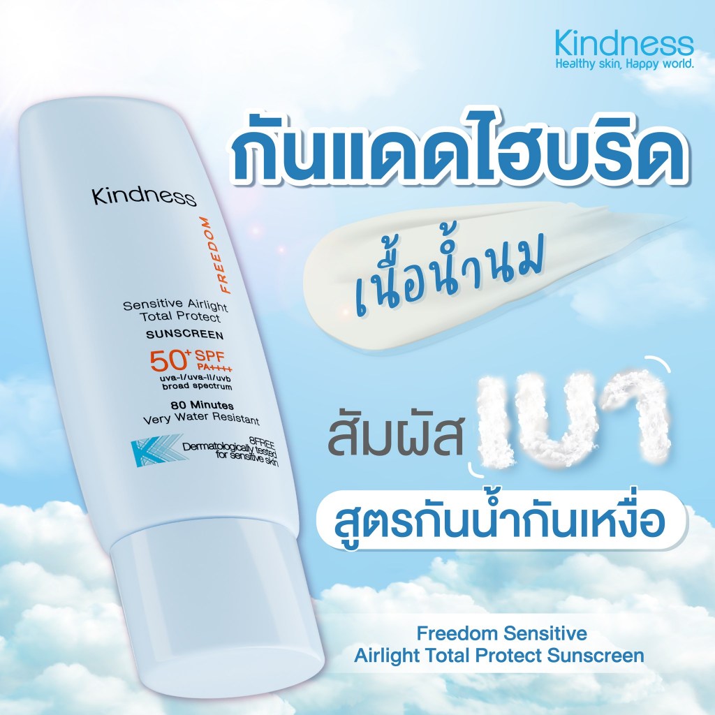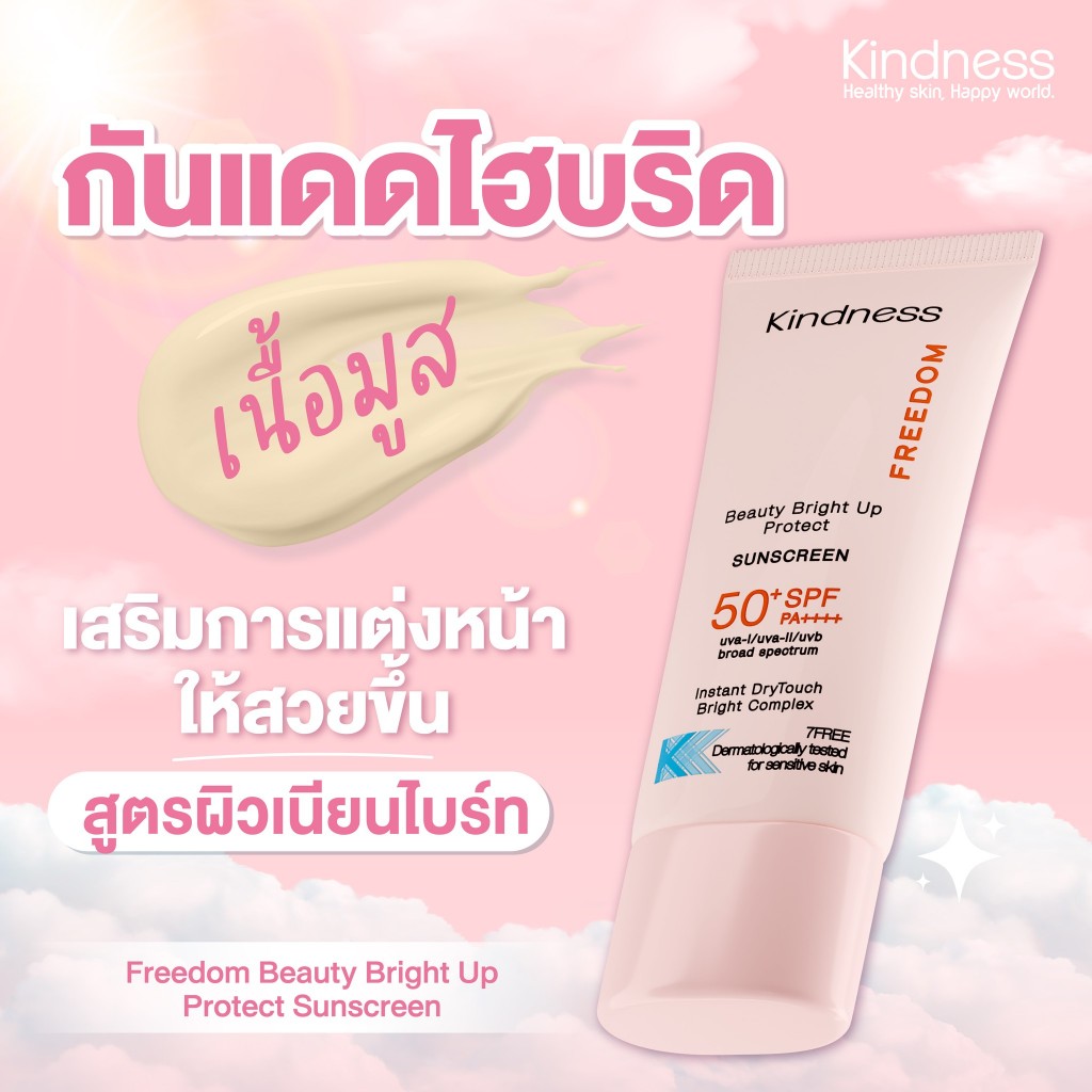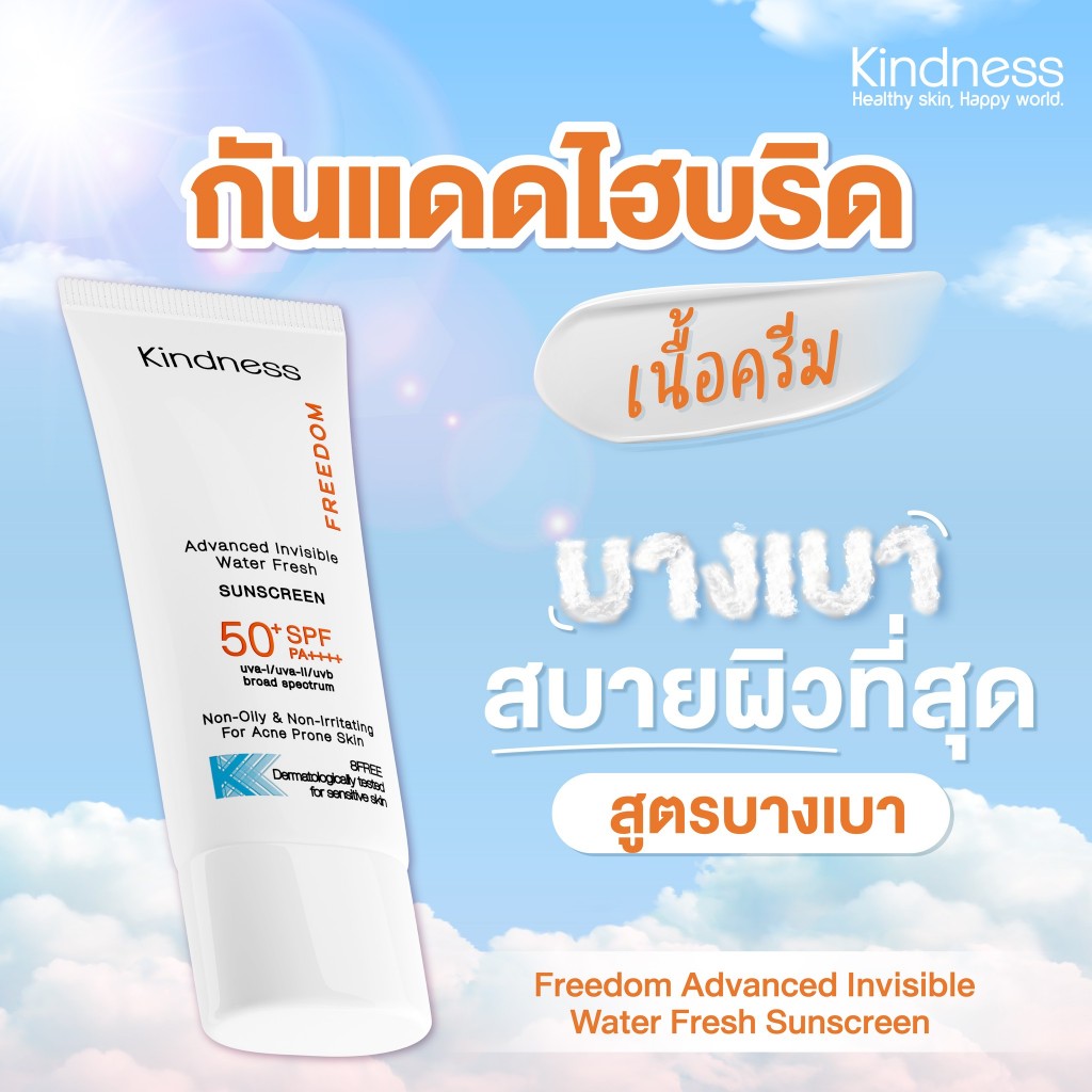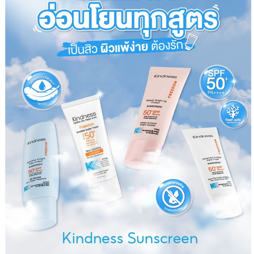กันแดด Kindness Freedom Sunscreen SPF 50+ PA++++ อ่อนโยนต่อผิวแพ ้ง่าย เบาบาง กันน้ำ เนียนไบรด์ 30ml