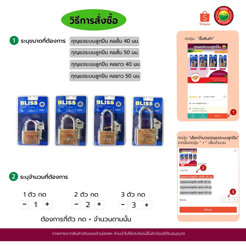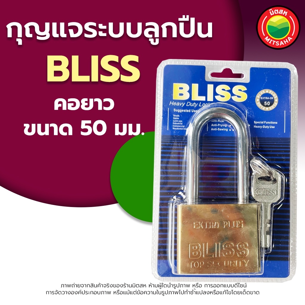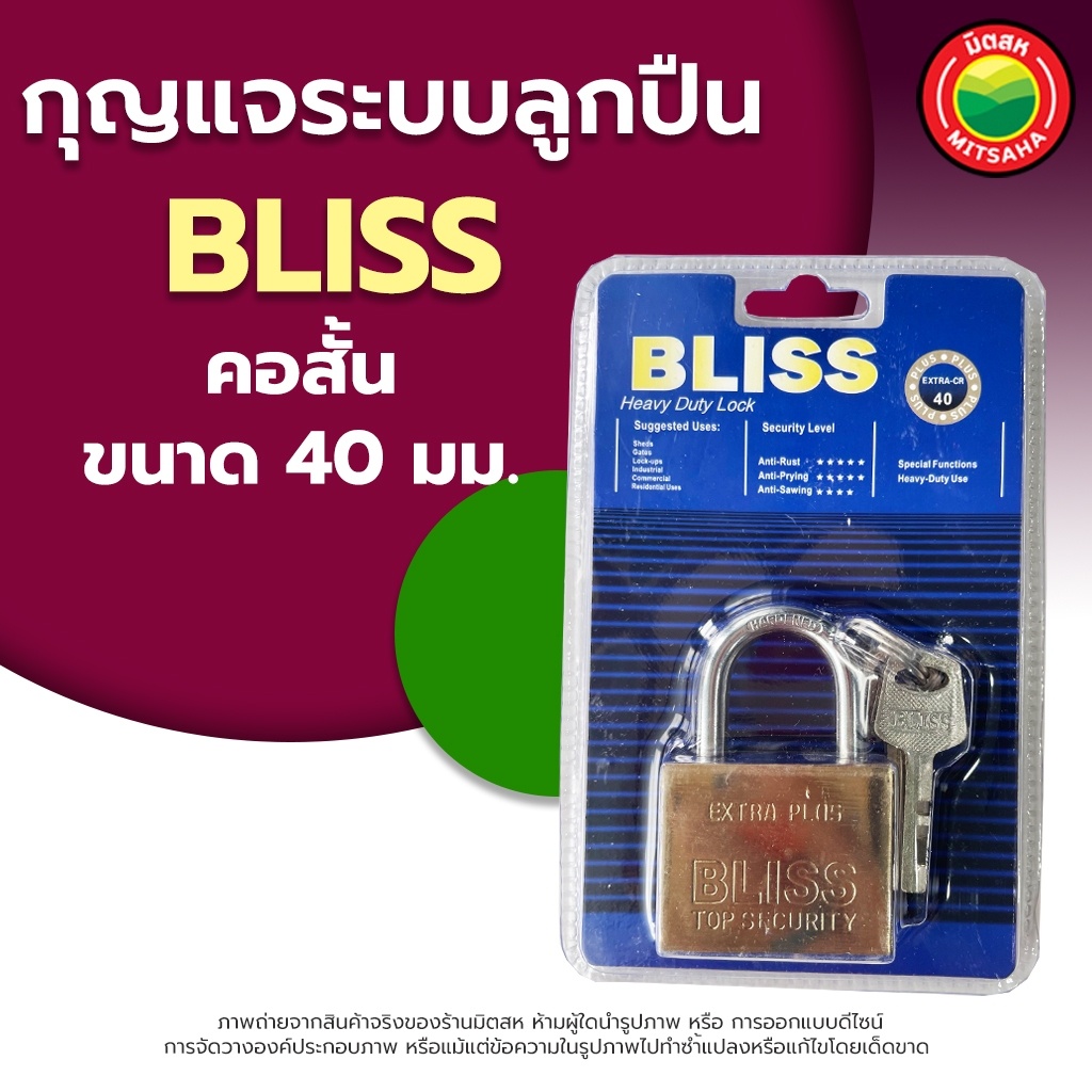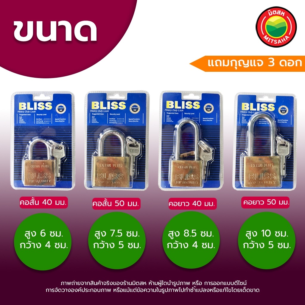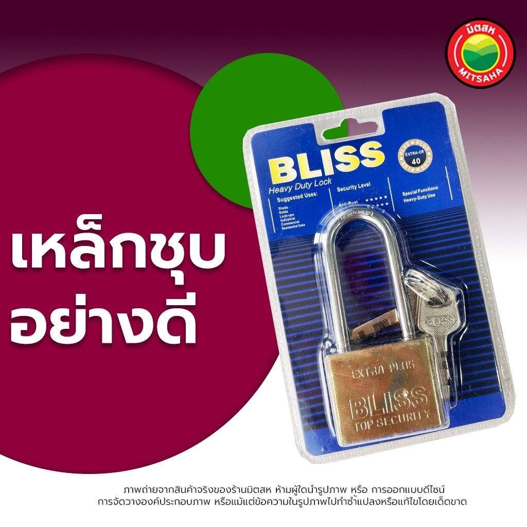 กุญแจ ระบบลูกปืน คอสั้น คอยาว BLISS ขนาด 40mm, 50mm PADLOCK สี่เหลี่ยม แม่กุญแจ กุนแจ สปริง ล็อค บ้าน สีเงิน คล้อง มิตสห