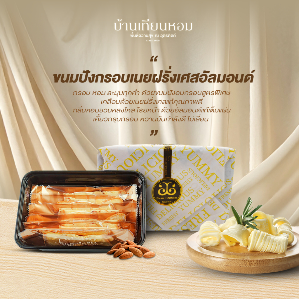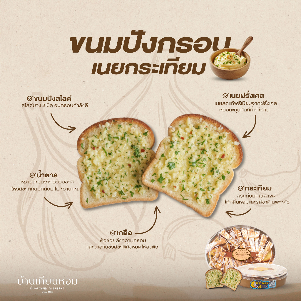 ขนมปังกรอบ | บ้านเทียมหอม | เนยฝรั่งเศส 3 รสชาติ ( กระเทียม , อัลมอนด์ , ทุเรียนลับแล )