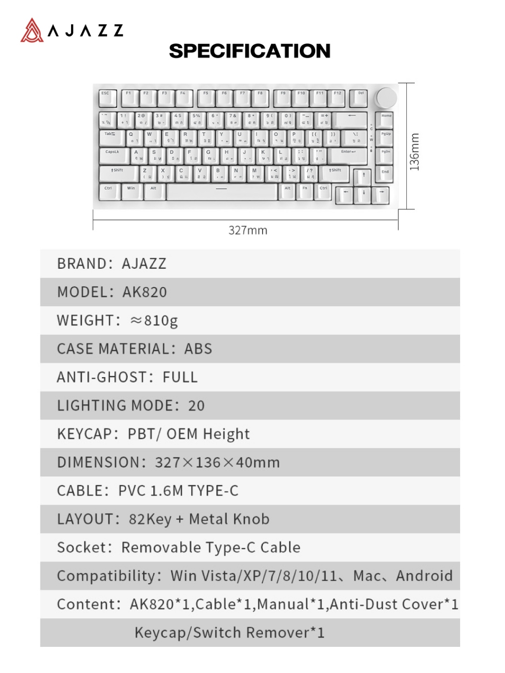 คีย์บอร์ดเกมมิ่ง Ajazz AK820 82Key Gasket Hotswap Wired Mechanical Keyboard รับประกันสินค้า 1 ปี