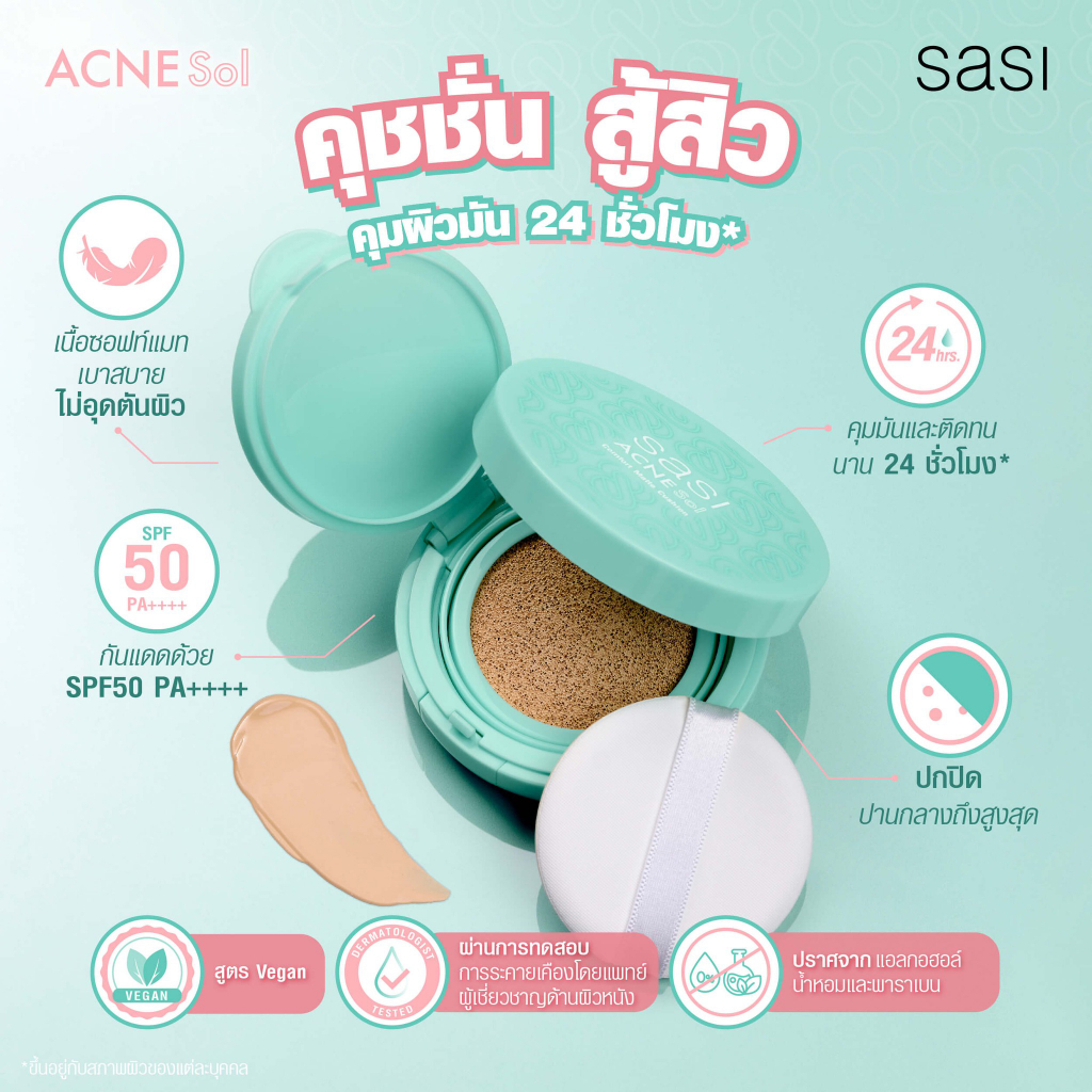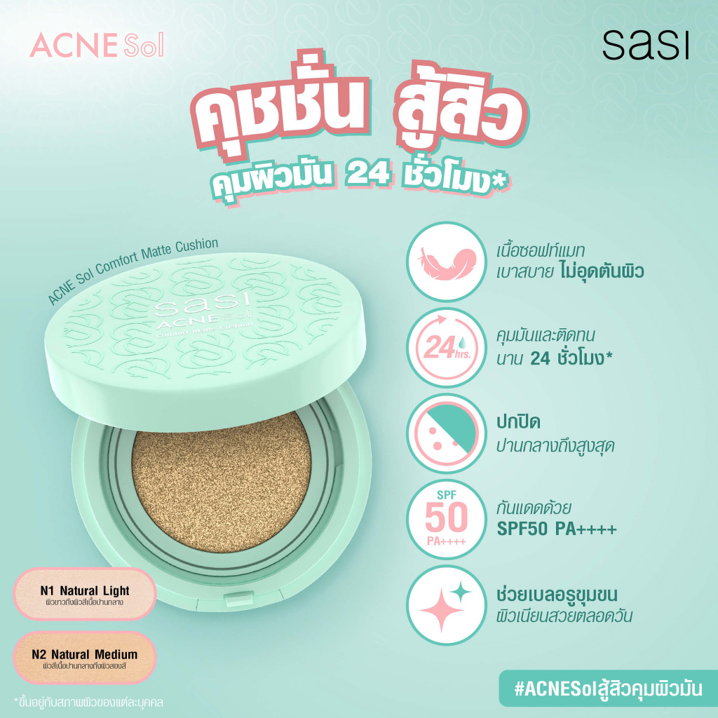 คุชชั่น ศศิ แอคเน่ โซล คอมฟอร์ท แมท Sasi Acne Sol Comfort Matte Cushion SPF50 PA++++ 10g.