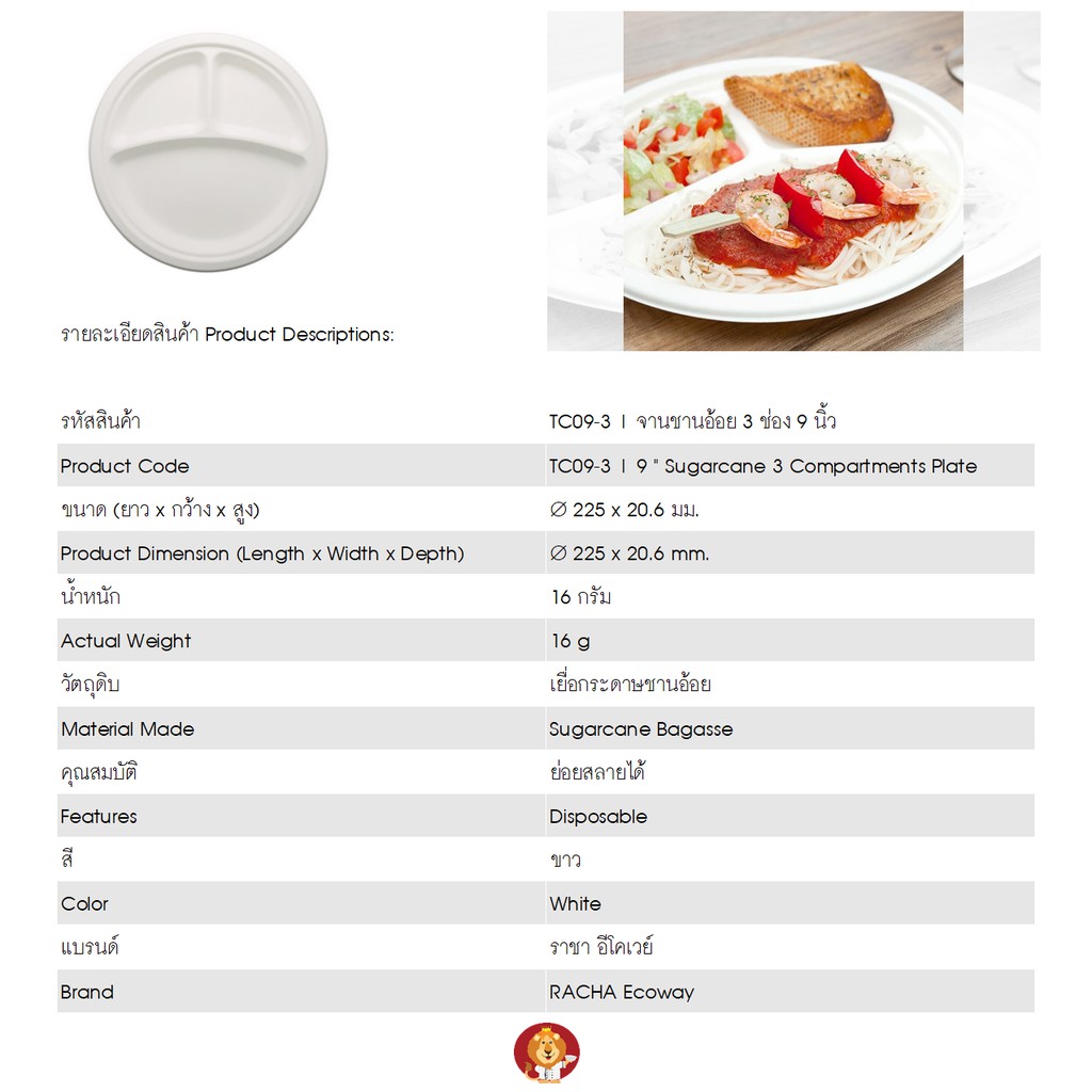 จานชานอ้อย 3 ช่อง 9 นิ้ว สีขาว [ TC09-3 ] แบรนด์ ราชา Ecoway (50 ชิ้นต่อแพ็ค)