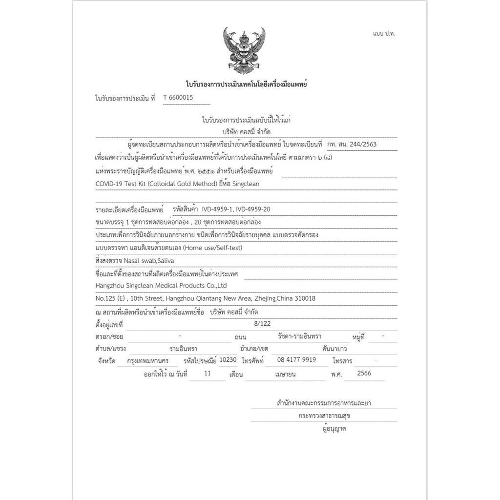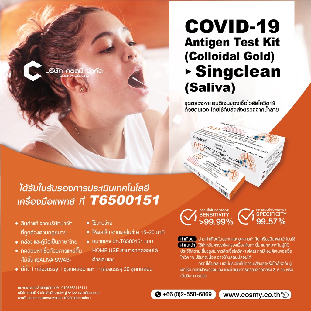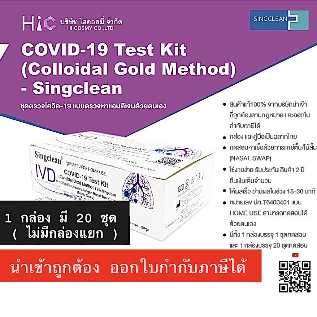ชุดตรวจatk ยี่ห้อsingclean แบบน้ำลาย(ตรวจจมูกได้)บรรจุ20testกล่องรวม ตรวจOmicron ได้ มีอย. ออกใบกำกับภาษีได้