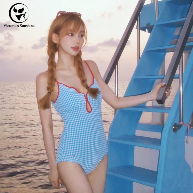 ชุดว่ายน้ำ รุ่นใหม่ ชุดว่ายน้ำวันพีช ลายสก๊อตสีฟ้า สไตล์ญี่ปุ่น สายรัดด้านหลังปรับระดับได้#0277