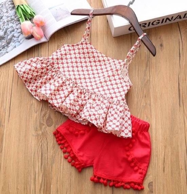 ชุดสายเดี่ยวสีแดงลายดอกไม้สีขาว น่ารักสุดๆ พร้อมด้วยกางเกงฟรุ๊งฟริ๊ง