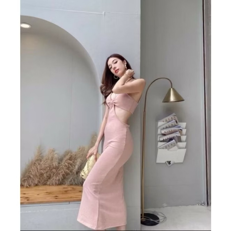 ชุดเดรสยาว ใส่ไปทะเล สุดแซ่บ เว้าอกสีชมพูนู้ด