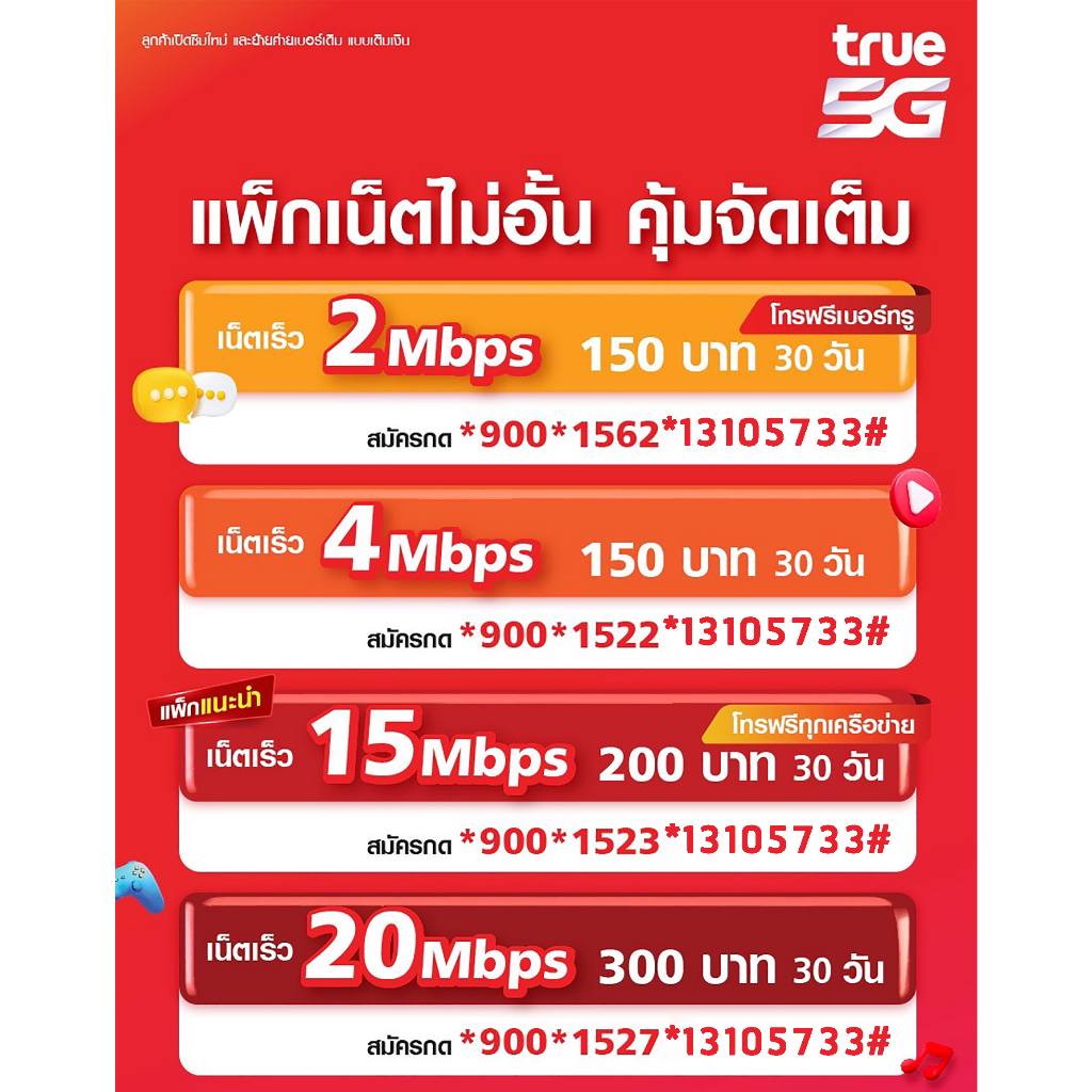 ซิมเทพทรู เน็ตไม่อั้น เลือกโปรได้ 4Mbps 15Mbps 20Mbps แถมโทรฟรีทุกค่าย