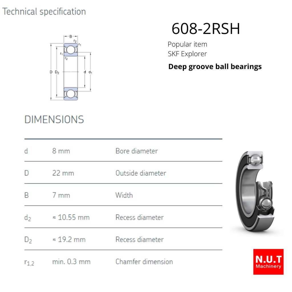 ตลับลูกปืนเม็ดกลมร่องลึก SKF 608-2RSH ฝายาง