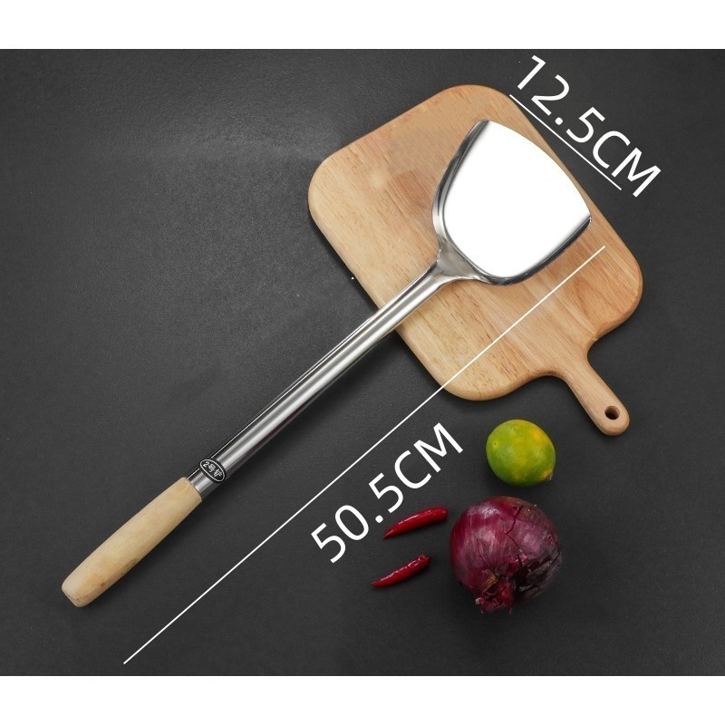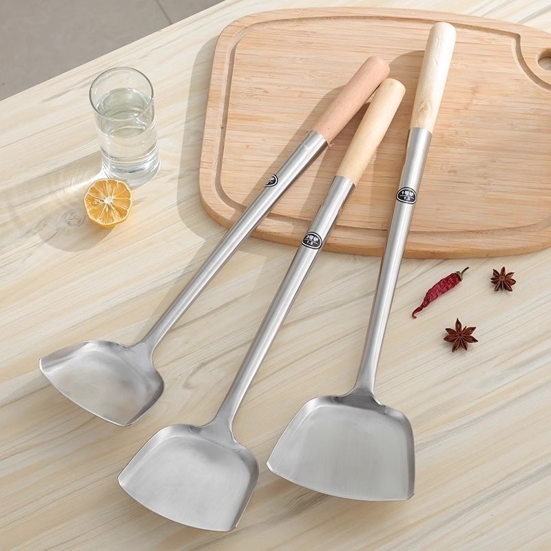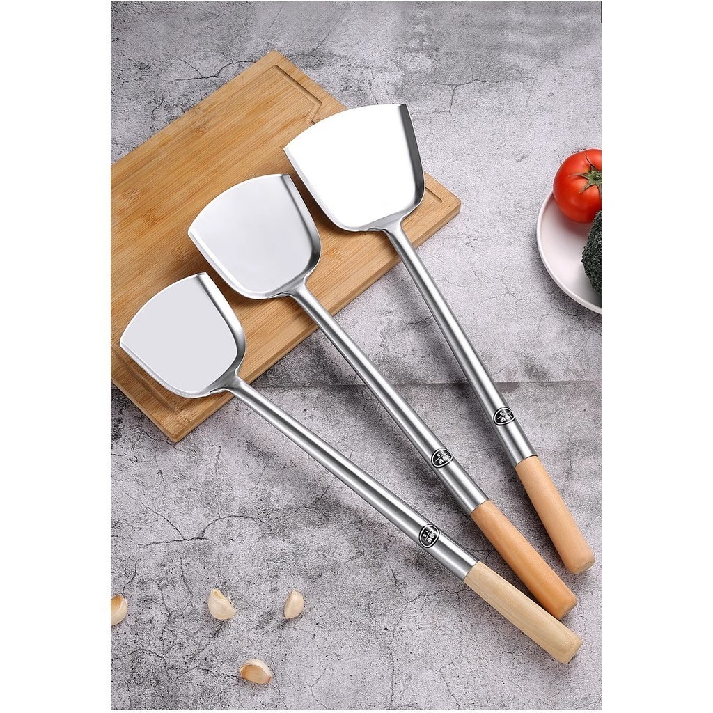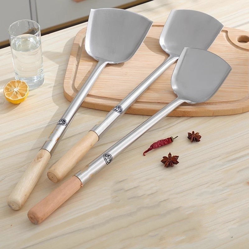 ตะหลิวด้ามไม้ยาว ตะหลิวใหญ่สแตนเลสด้ามยาวเพื่อความเจ็บป่วย ตะหลิวผัดผักช้อนส้อมผัดผักทัพพี