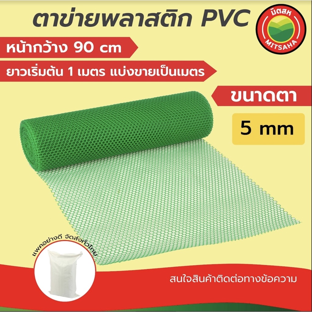 ตาข่าย พลาสติก พีวีซี PVC มิตสห สีเขียว ขนาดตา(รู) 5มิล หน้ากว้าง90ซม. แบ่งขายเป็นเมตร ยาวเริ่มต้น1เมตรPVCPlasticFlatNet