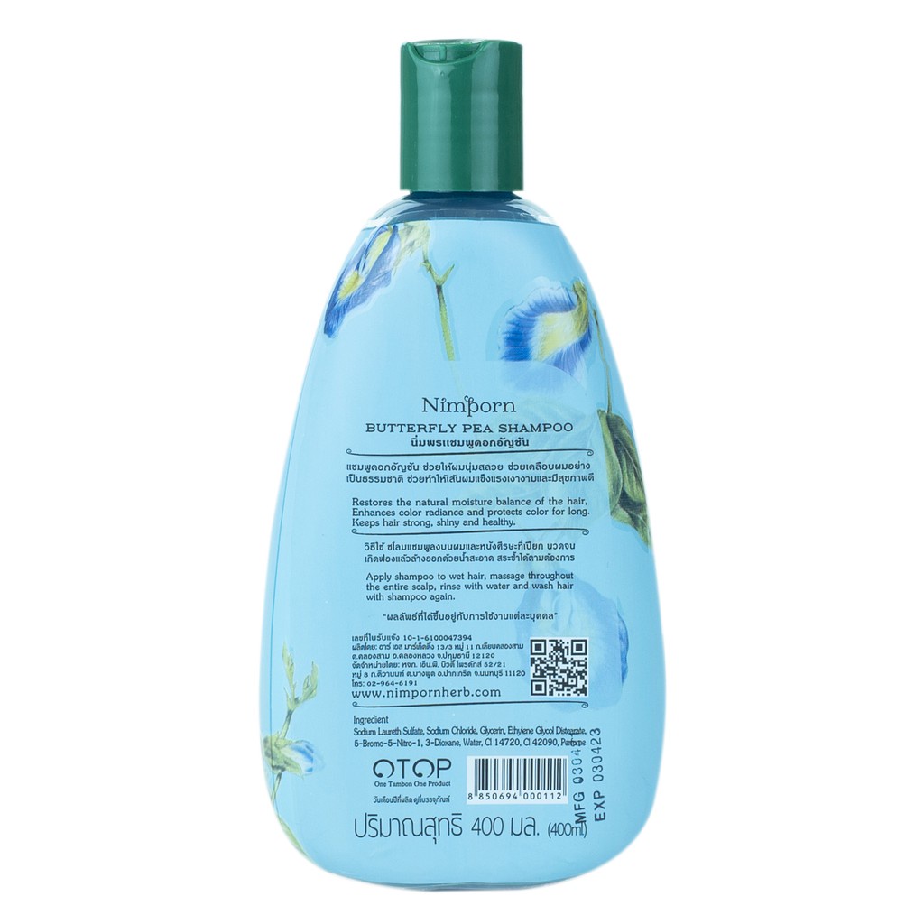 นิ่มพร แชมพูดอกอัญชัญ 400 มล. (แชมพูเพิ่มคุณสมบัติของอัญชัญให้ผมดำเงางามเป็นประกาย)