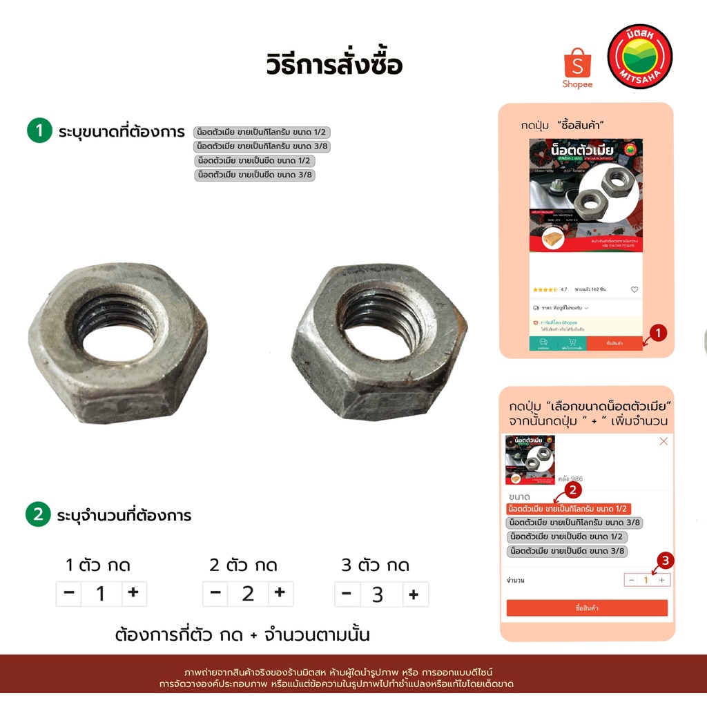 น็อต ตัวเมีย หัวน็อต ขายเป็นขีด ขนาด 3/8, 1/2 นิ้ว NUT นอต น๊อต น็อท ตัวเมีย เกลียวมิล นัต สแตนเลส มิล ดำ ชุบขาว มิตสห