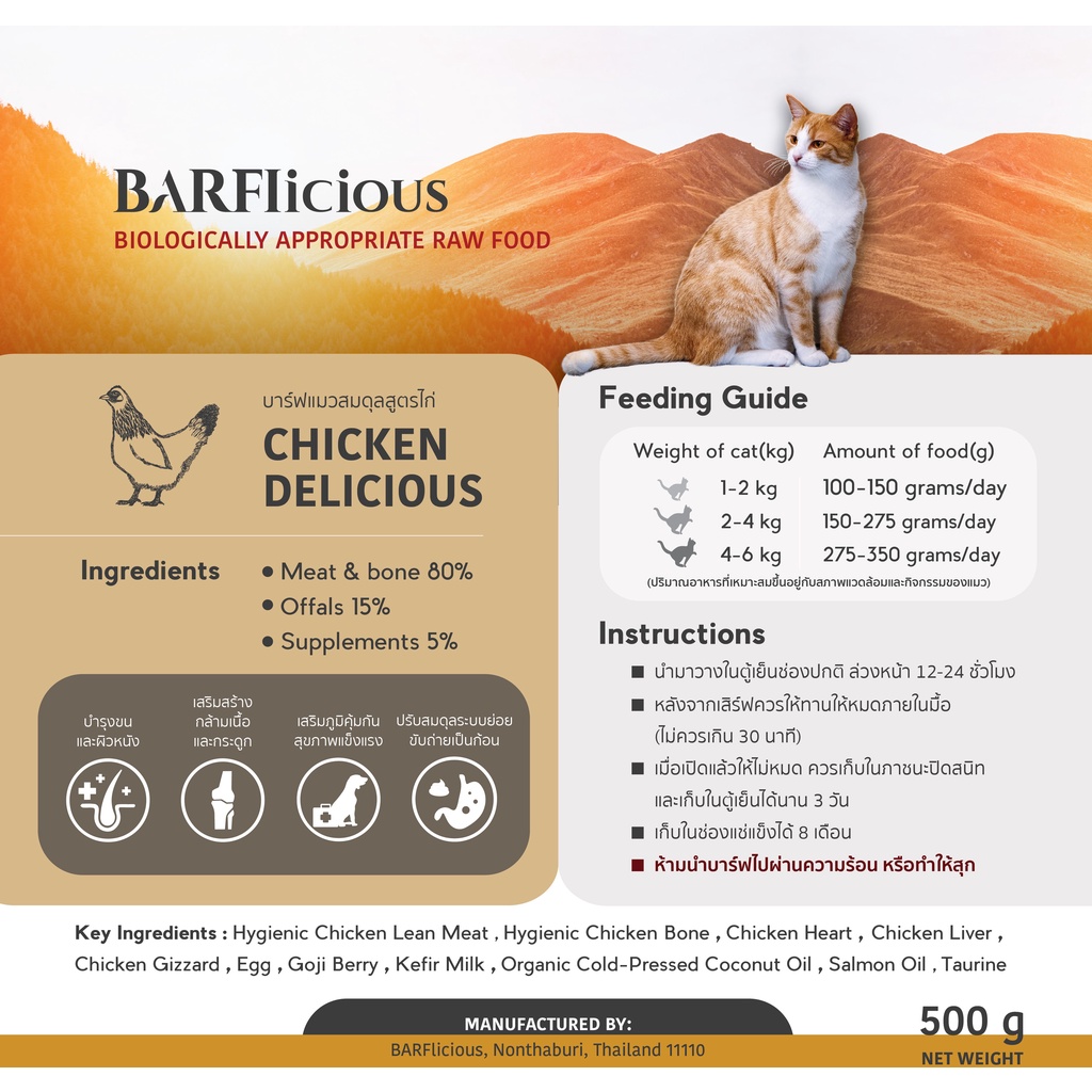 บาร์ฟแมวสมดุลแช่แข็ง BARF สมดุลสูตรไก่ CHICKEN DELICIOUS ขนาด 500 กรัม