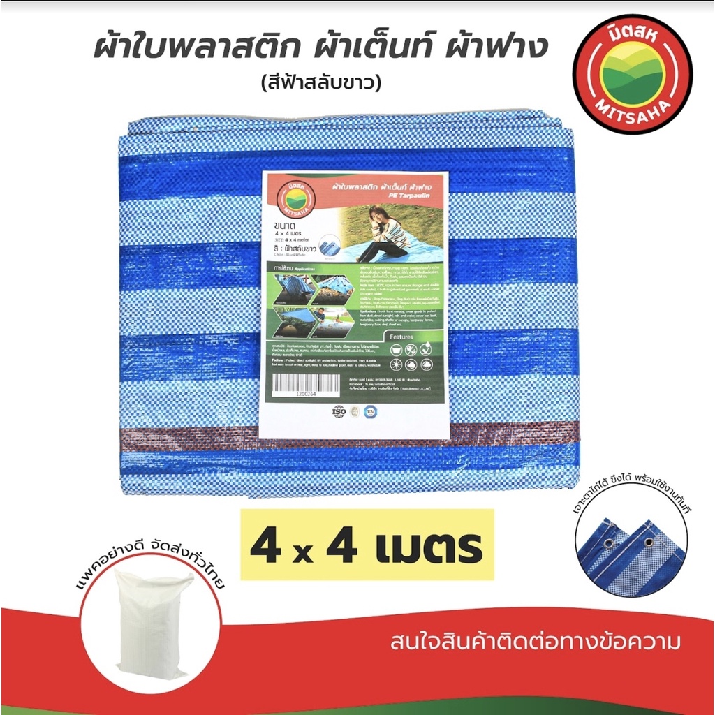 ผ้าใบพลาสติกบลูชีท ฟ้าขาว MITSAHA™️ เกรดAA ขนาด 4x4 เมตร ผ้าเต็นท์ ผ้าฟาง ผ้าใบพลาสติก มิตสห™️ PE TARPAULIN BLUE WHITE