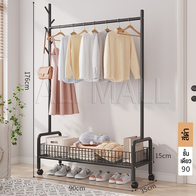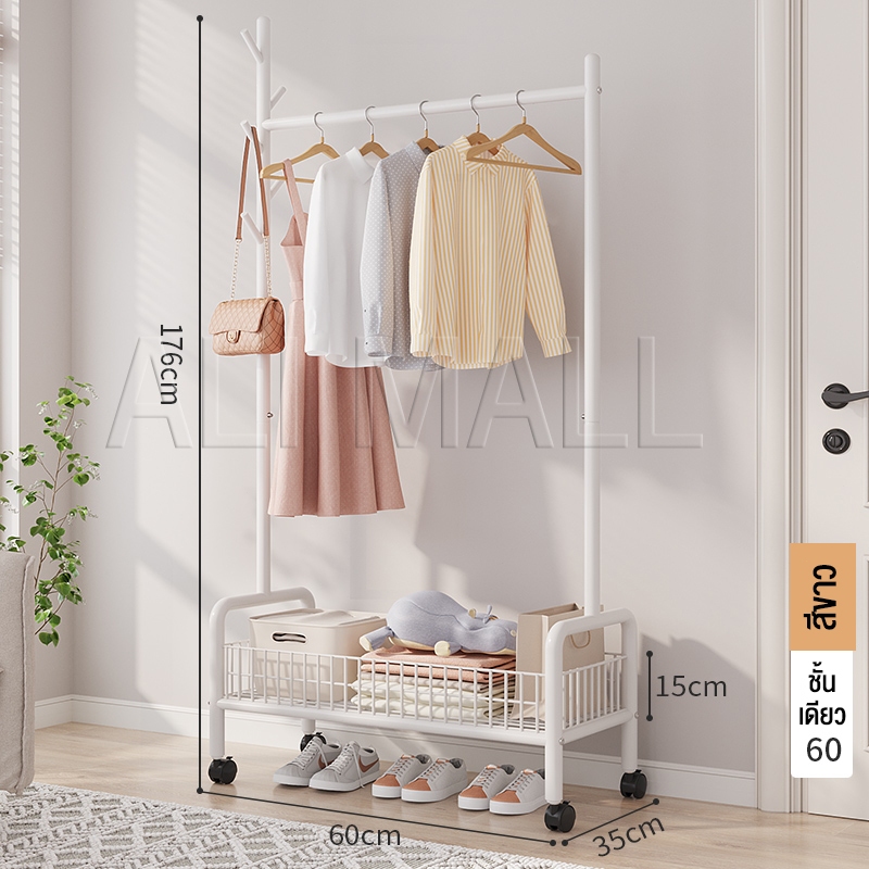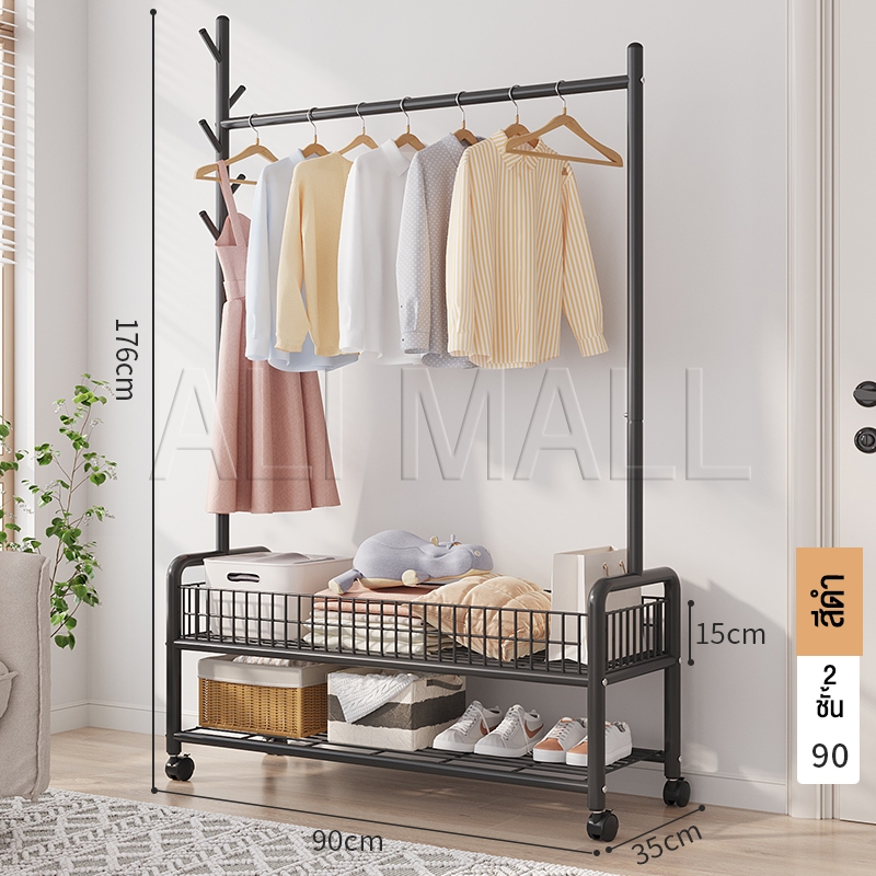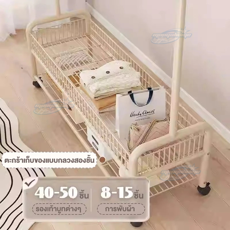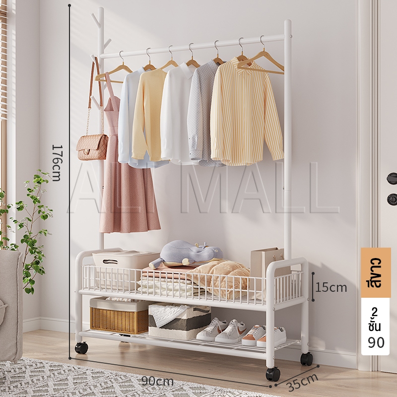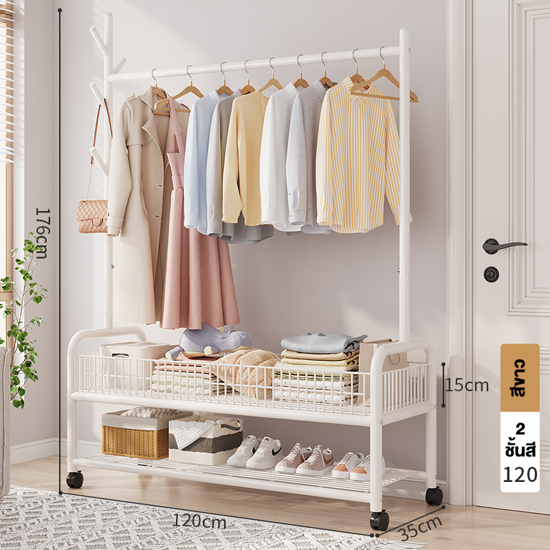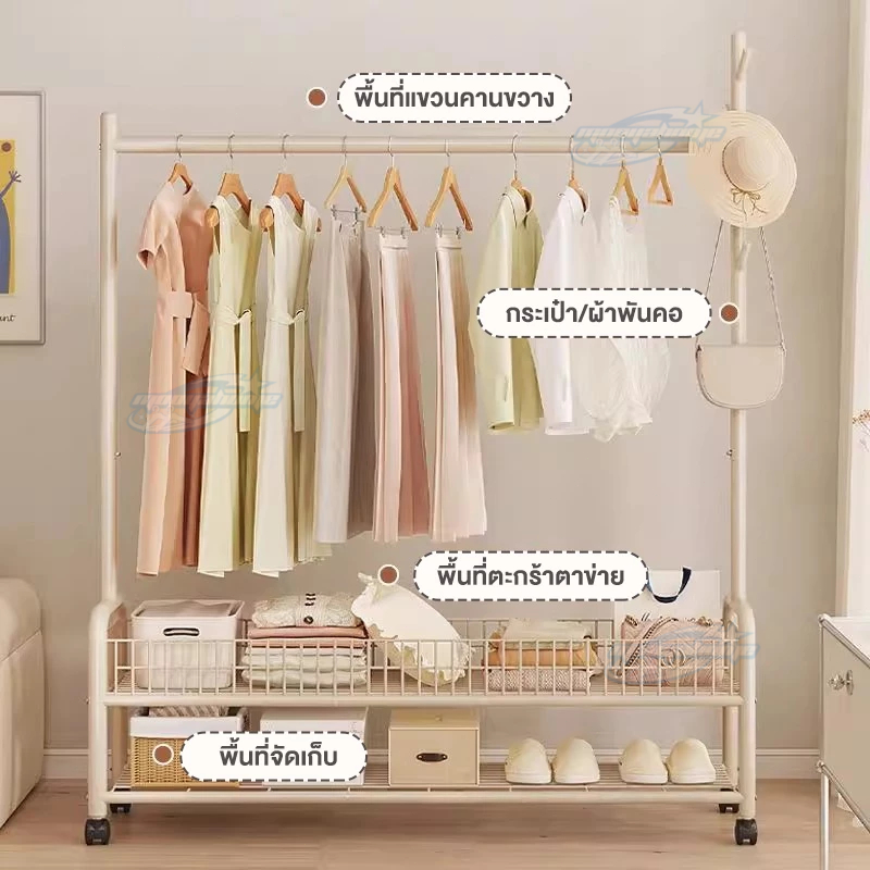ราวแขวนผ้า ราวตากผ้า พร้อมเสาเเขวนหมวก+ตะกร้ากระเป๋า ที่แขวนผ้า พร้อมชั้นวางของด้านล่าง มีล้อเลื่อน