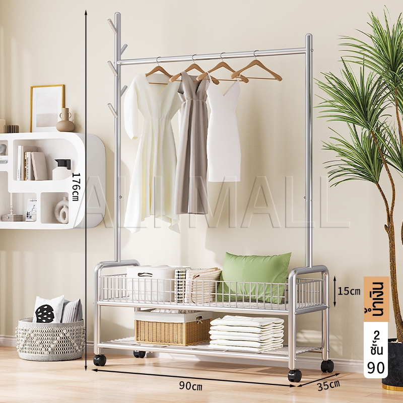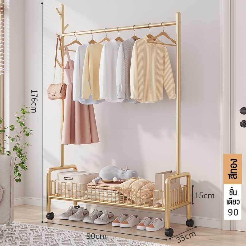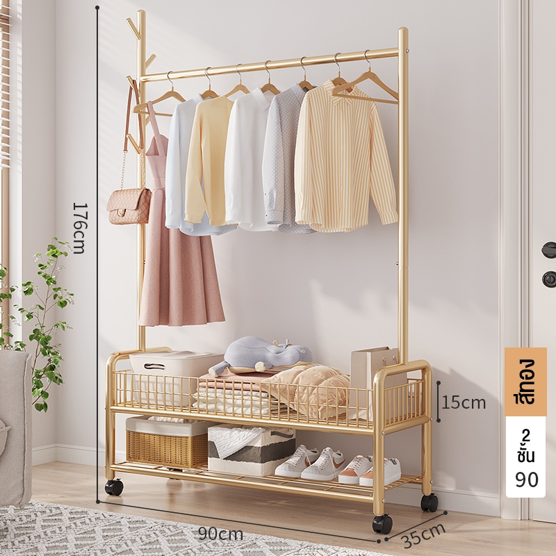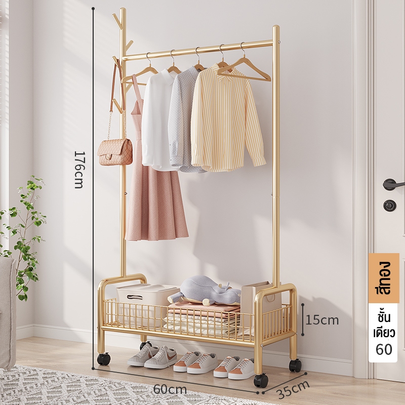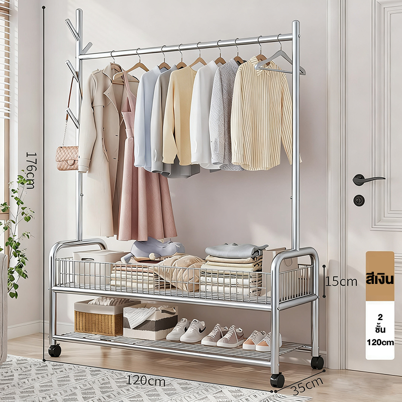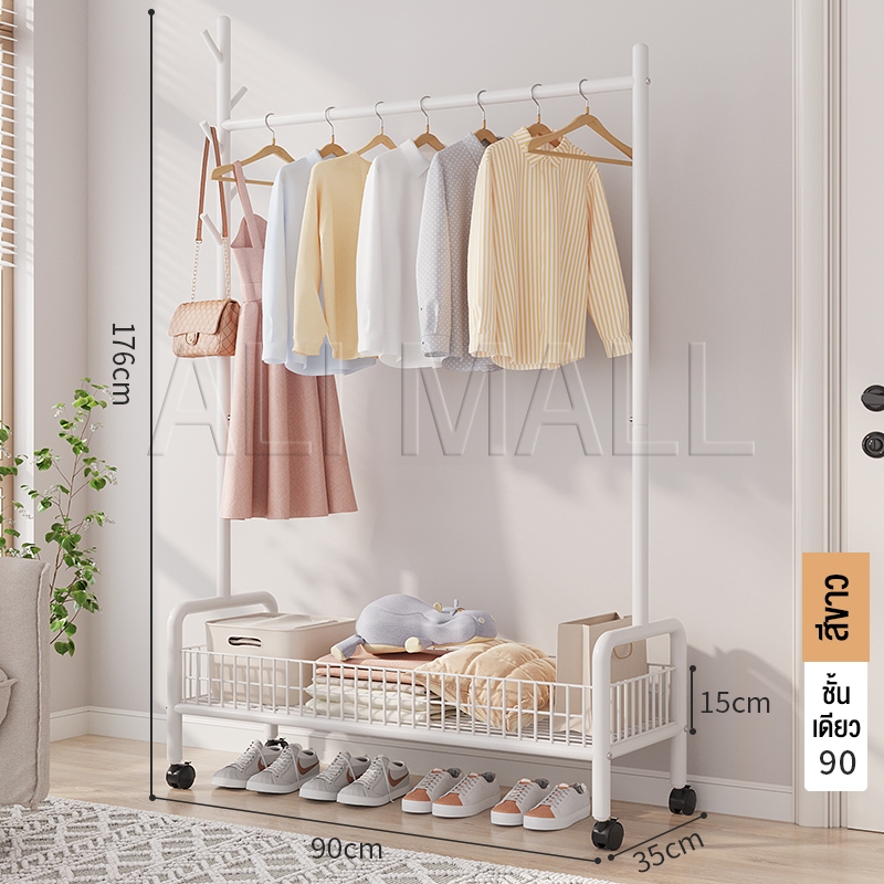 ราวแขวนผ้า ราวตากผ้า พร้อมเสาเเขวนหมวก+ตะกร้ากระเป๋า ที่แขวนผ้า พร้อมชั้นวางของด้านล่าง มีล้อเลื่อน