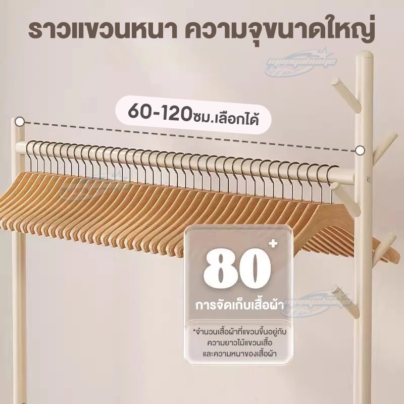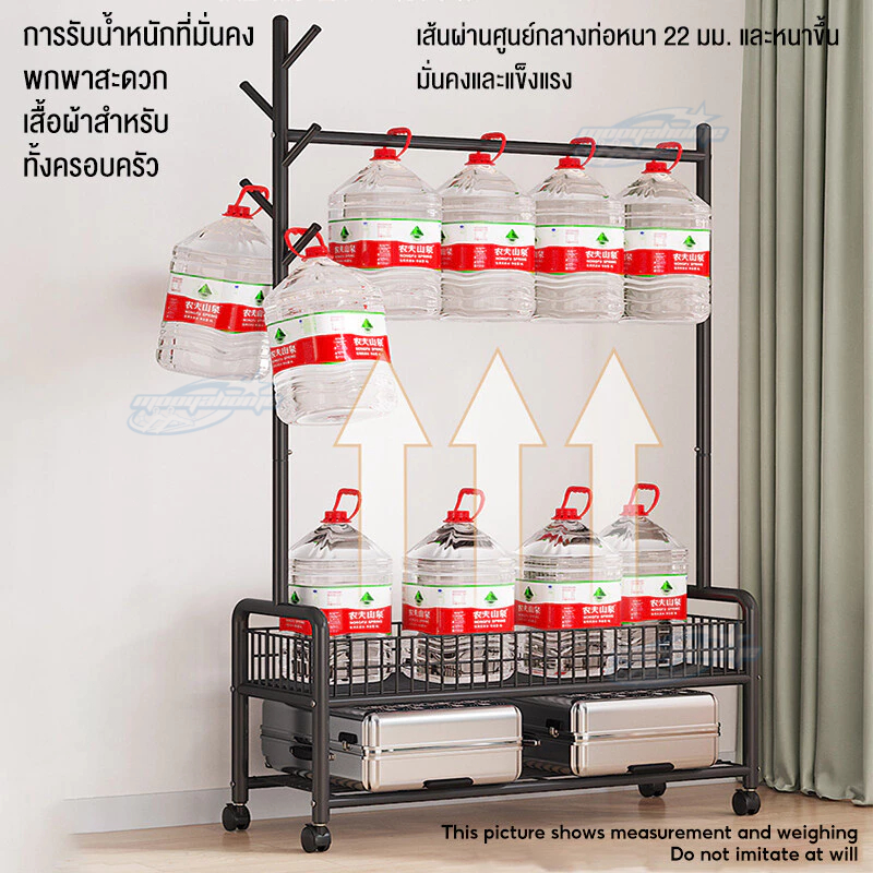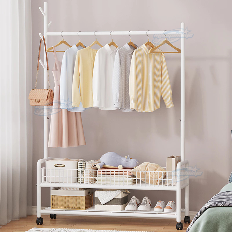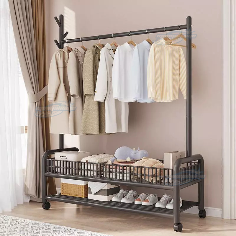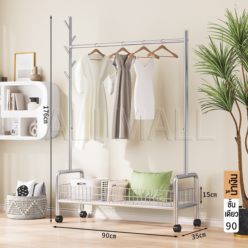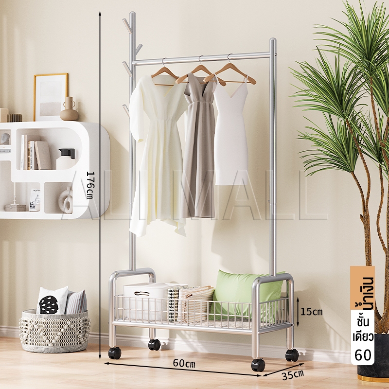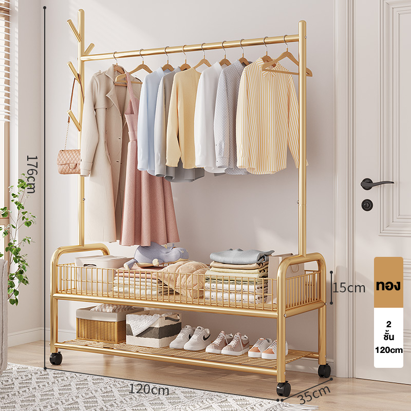 ราวแขวนผ้า ราวตากผ้า พร้อมเสาเเขวนหมวก+ตะกร้ากระเป๋า ที่แขวนผ้า พร้อมชั้นวางของด้านล่าง มีล้อเลื่อน