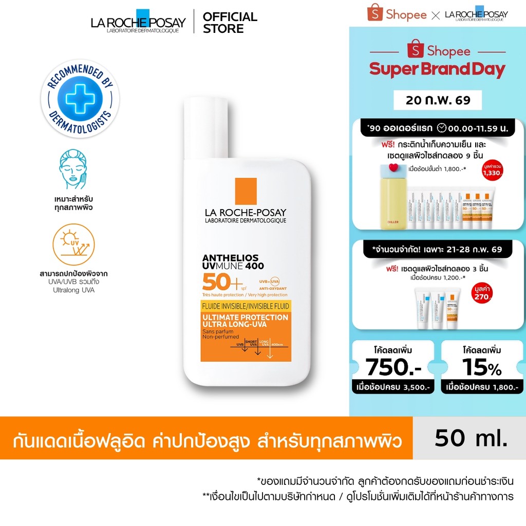 ลา โรช-โพเซย์ La Roche-Posay Anthelios UVMune 400 Invisible Fluid กันแดด เอสพีเอฟ50+ และ PA++++ 50ml.