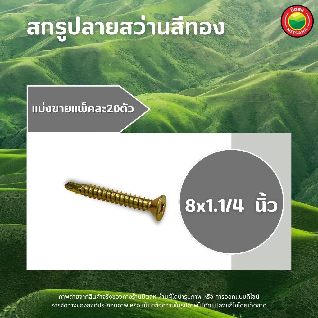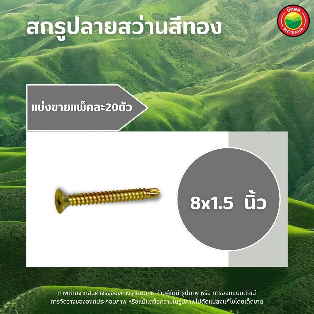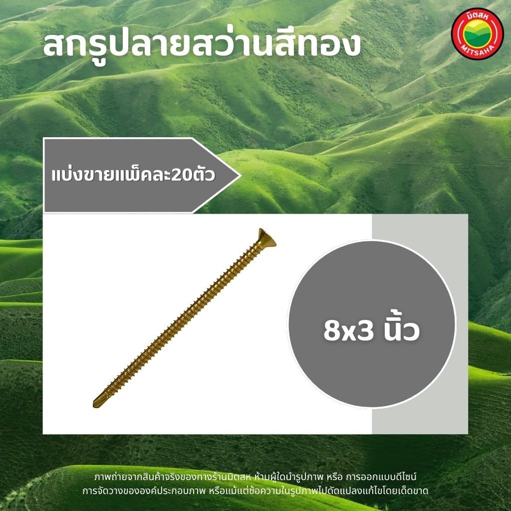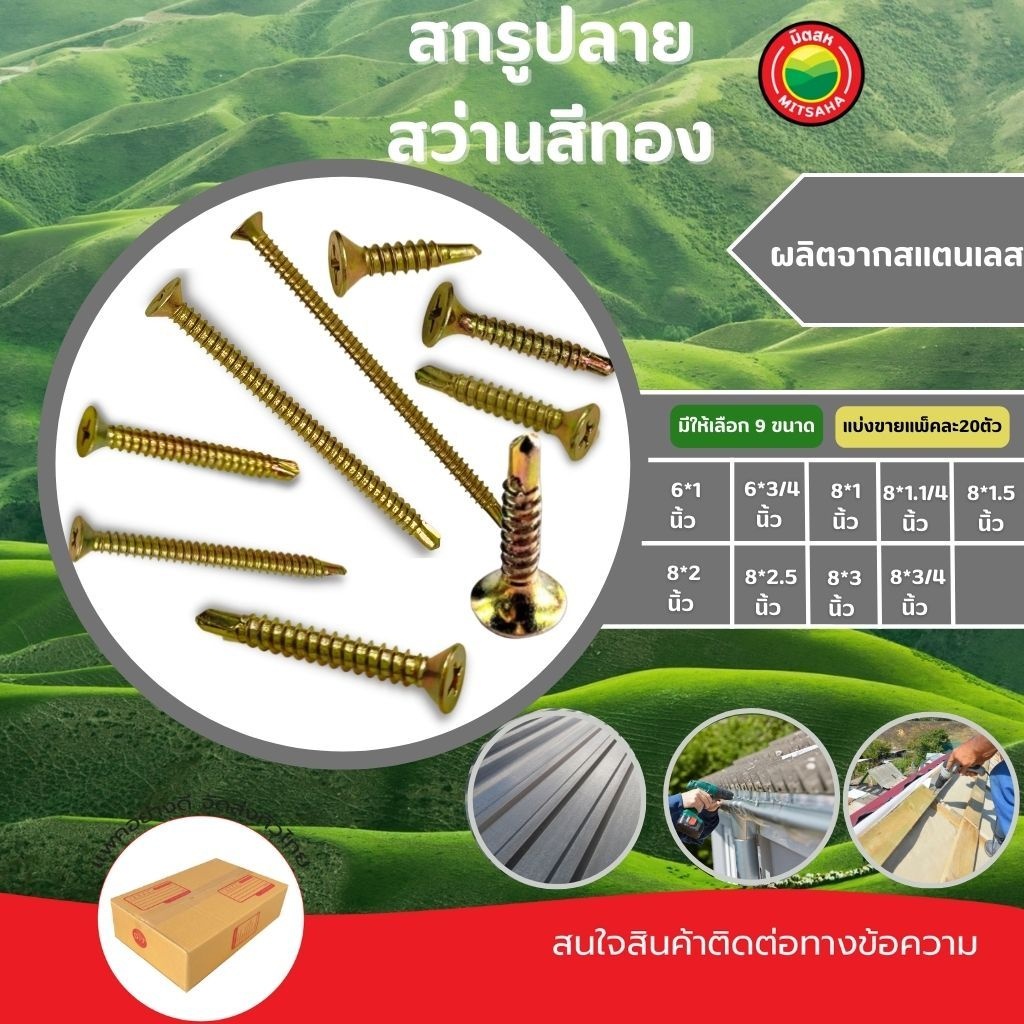 สกรู ปลายสว่านสีทอง แพ็คละ 20ตัว ขนาด 6x1, 6x3/4, 8x1, 8x1.1/4, 8x1.5, 8x2, 8x2.5, 8x3, 8x3/4" SELF TAPPING SCREWS มิตสห