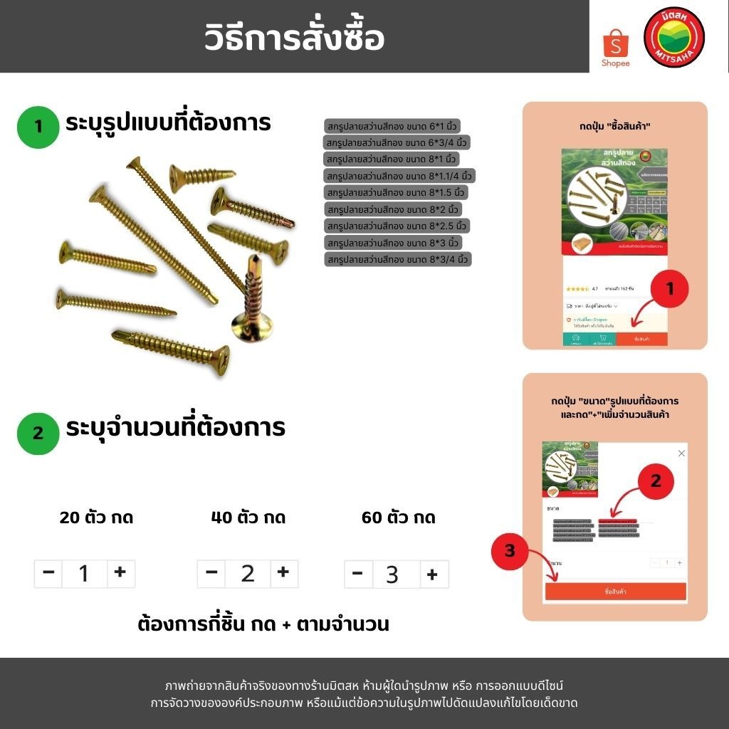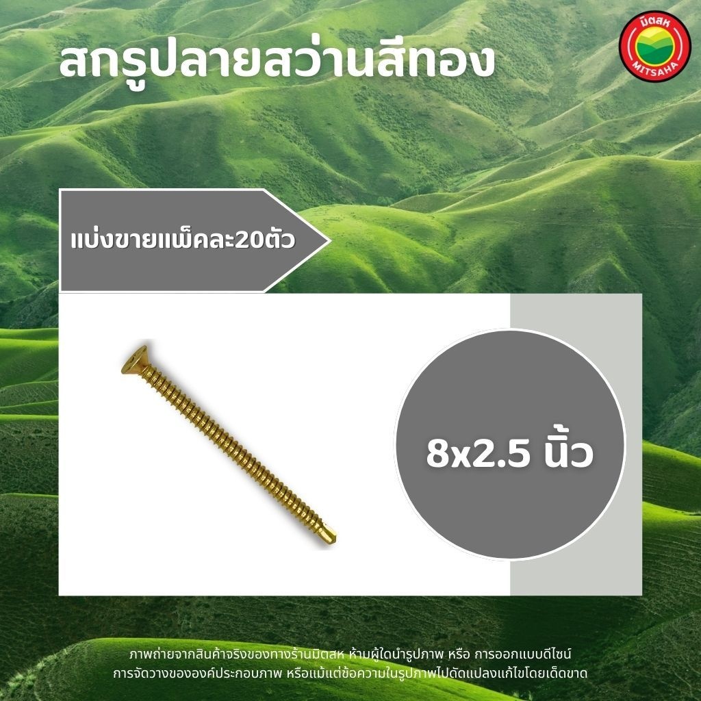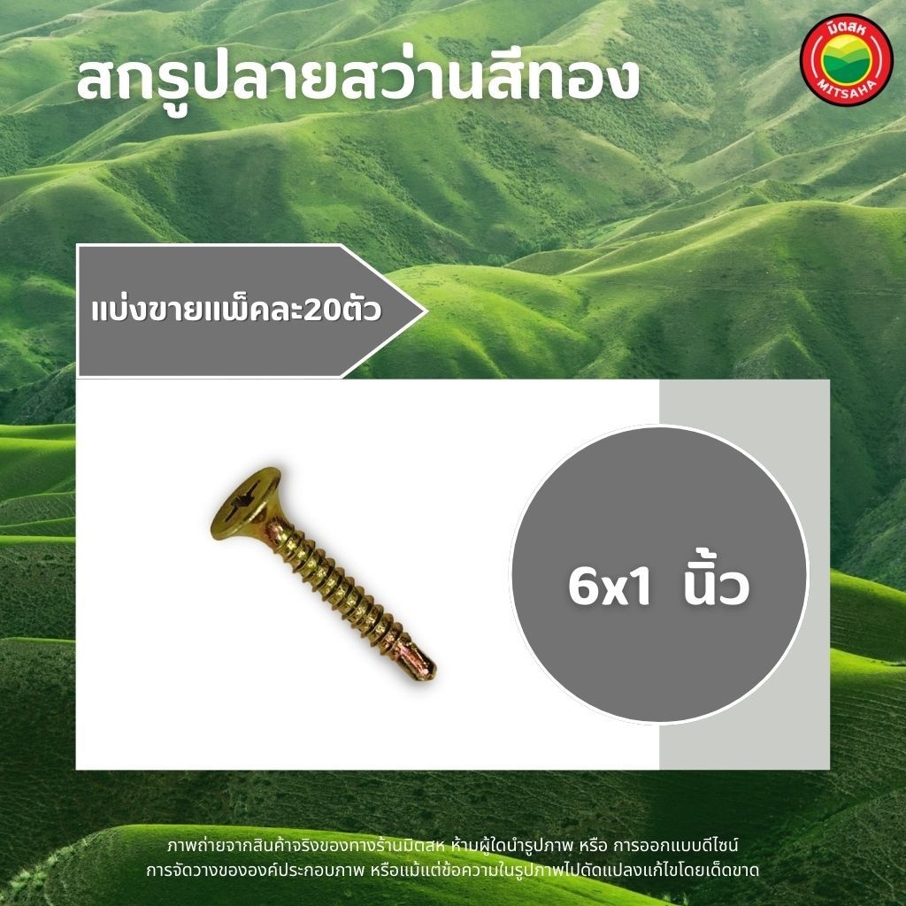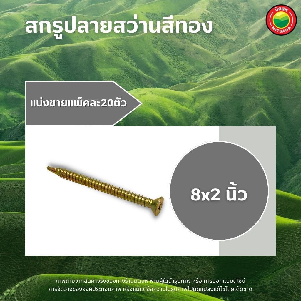 สกรู ปลายสว่านสีทอง แพ็คละ 20ตัว ขนาด 6x1, 6x3/4, 8x1, 8x1.1/4, 8x1.5, 8x2, 8x2.5, 8x3, 8x3/4" SELF TAPPING SCREWS มิตสห
