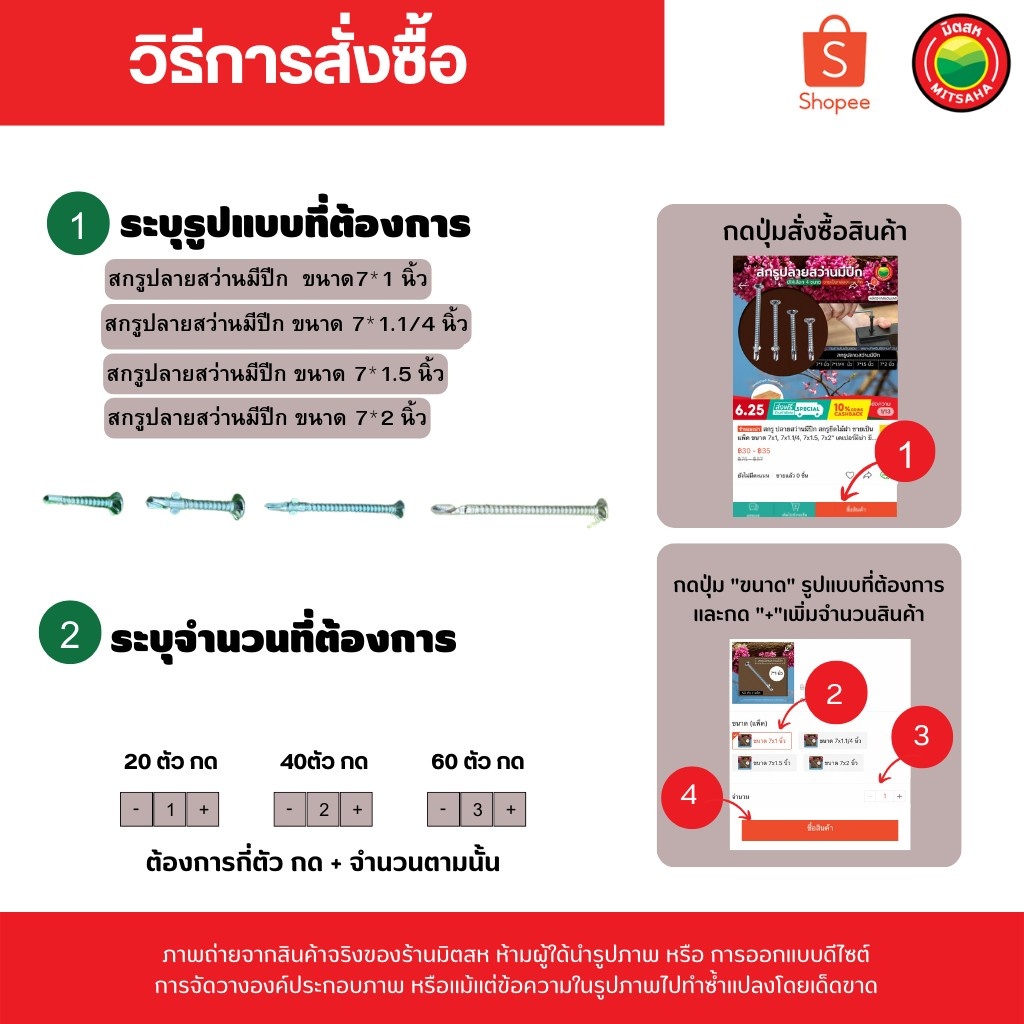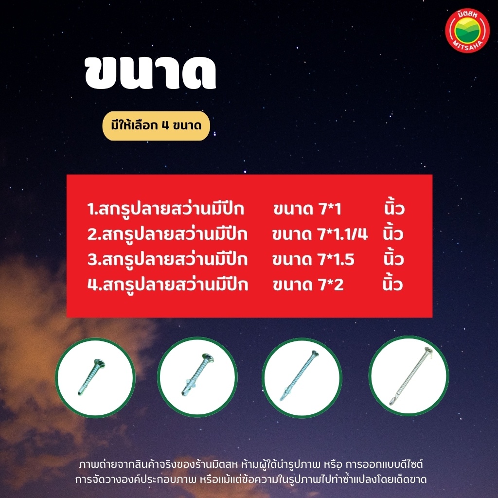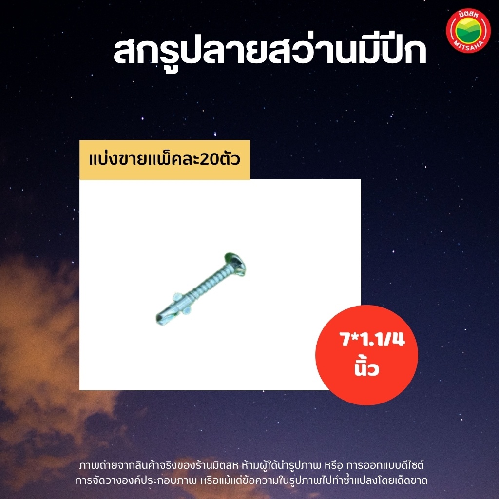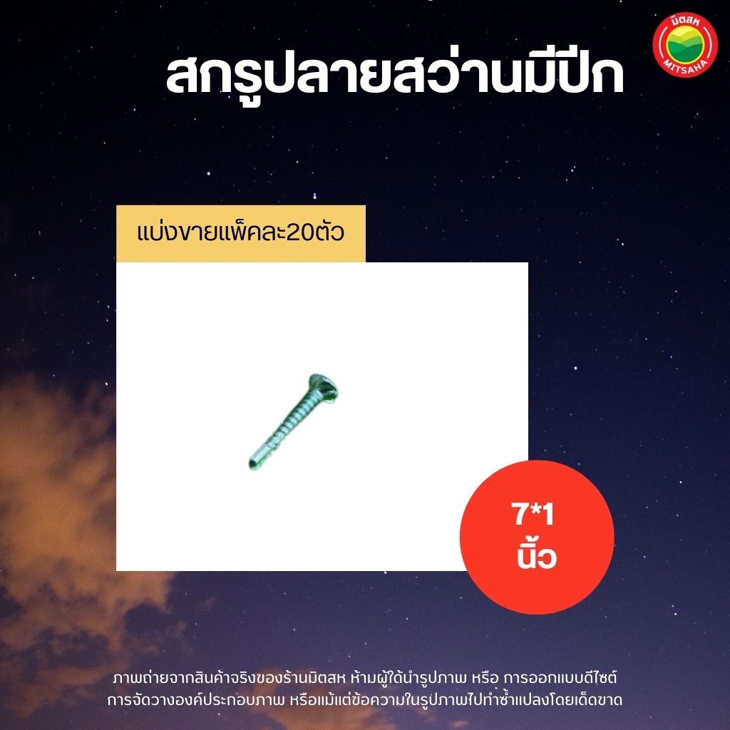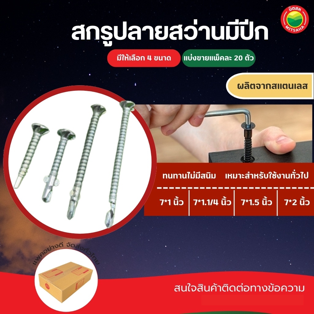 สกรู ปลายสว่าน มีปีก สกรูยึดไม้ฝา ขายเป็นแพ็ค 20 ตัว ขนาด 7x1,7x1.1/4,7x1.5,7x2 นิ้ว เตเปอร์มีบ่า ยึดเหล็ก มิตสห Mitsaha
