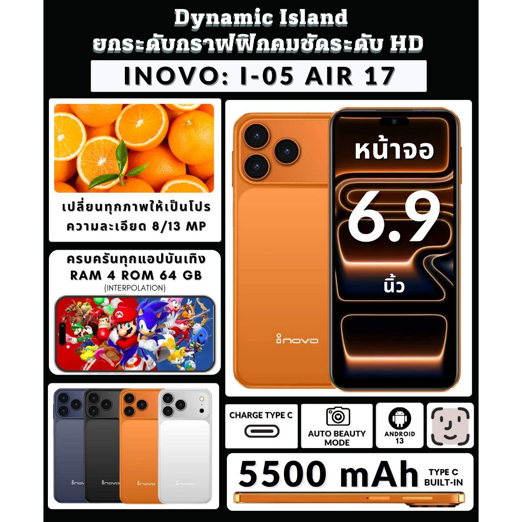 สมาร์ทโฟน INOVO I-05 Air 17 | จอใหญ่ 6.9 นิ้ว | Dynamic Island | RAM 4GB ROM 64GB | แบต 5500mAh