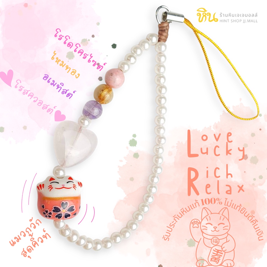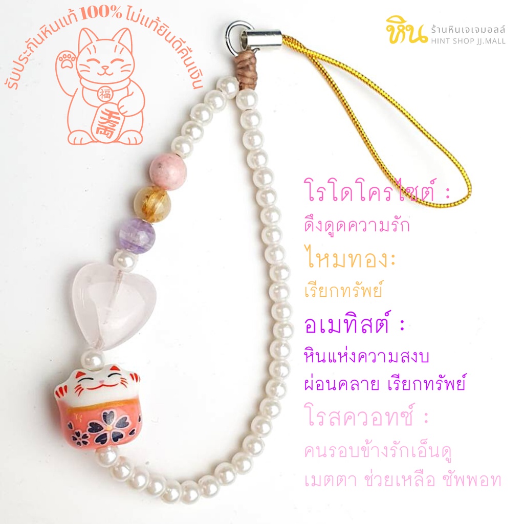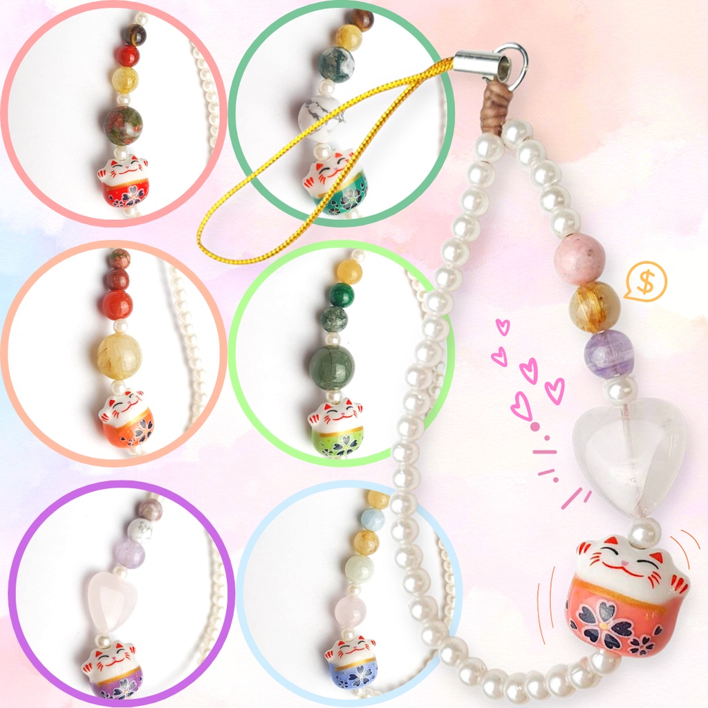แมวฟ้ามาแล้ว ! จี้สายคล้องแมวกวัก คล้องมือถือ คล้องกระเป๋า หินอัญมณีมงคลแท้เสริมโชค ของขวัญ