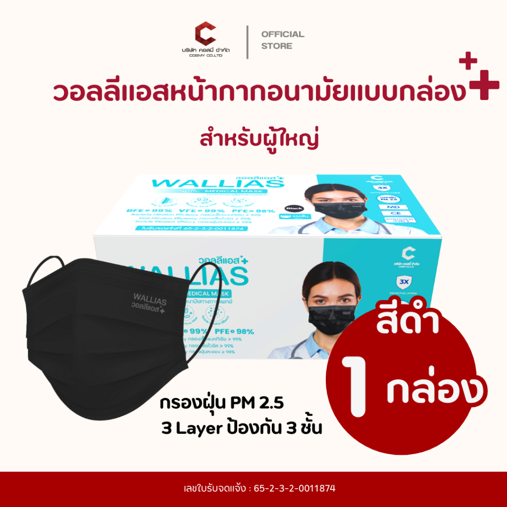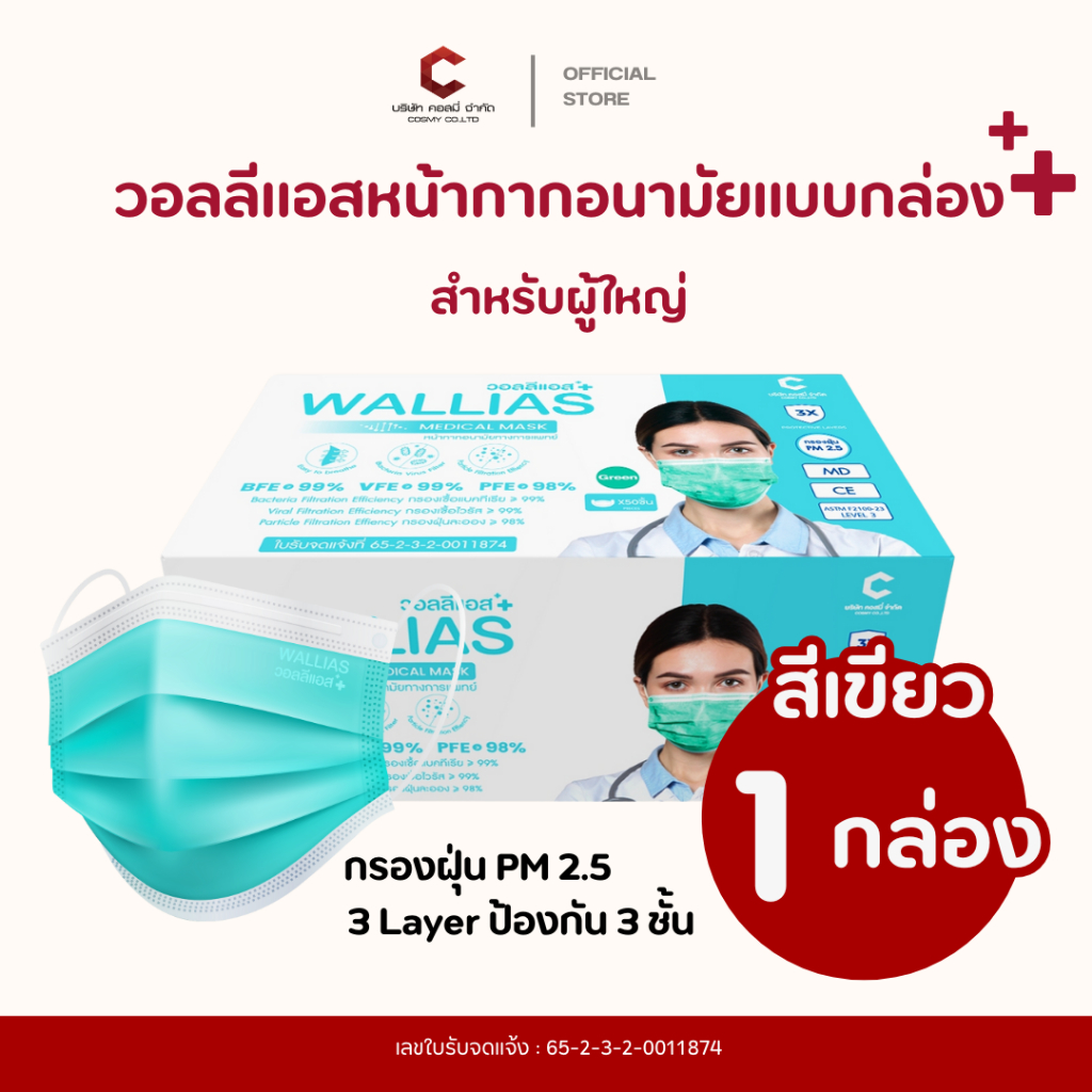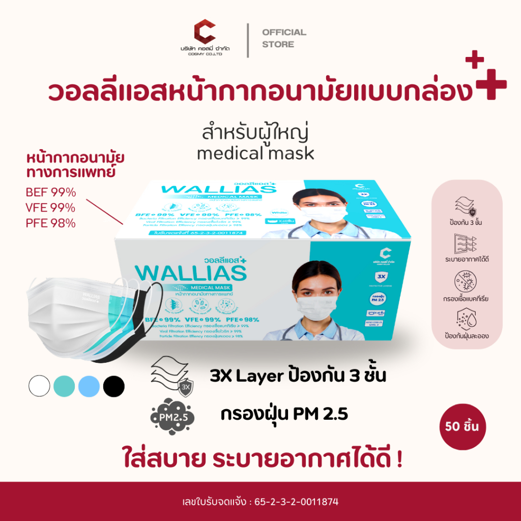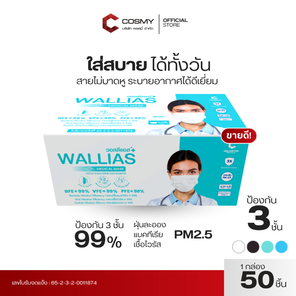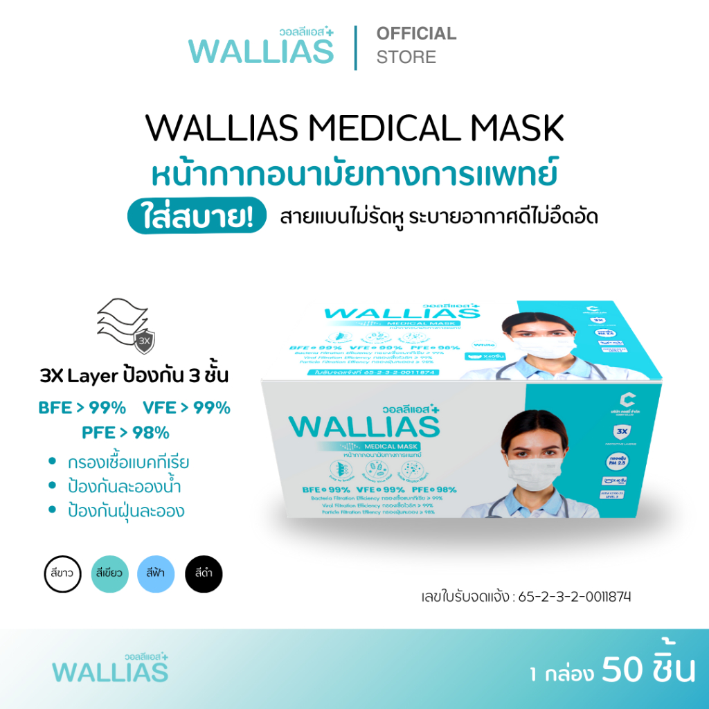 Wallias หน้ากากอนามัย เกรดการแพทย์ หนา 3 ชั้น แมส ป้องกัน ฝุ่น PM2.5 ไวรัส แบคทีเรีย 99% Medical Mask