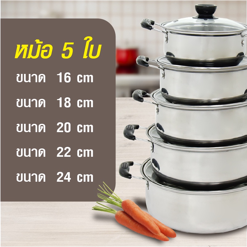 หม้อสแตนเลส เซ็ต5ชิ้น 5ขนาด 16/18/20/22/24 cm พร้อมฝาแก้ว หม้อทำอาหาร หม้อหุงต้ม หม้อแกง
