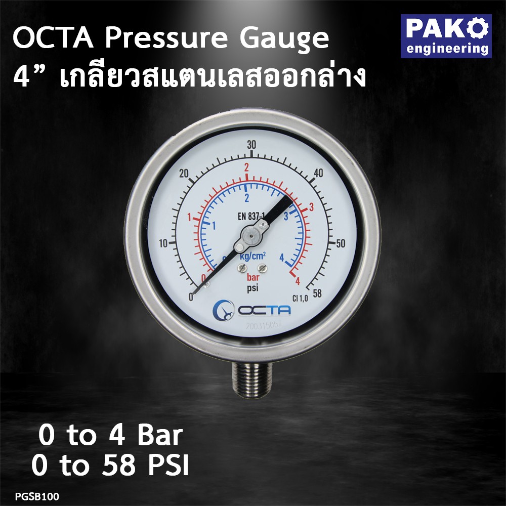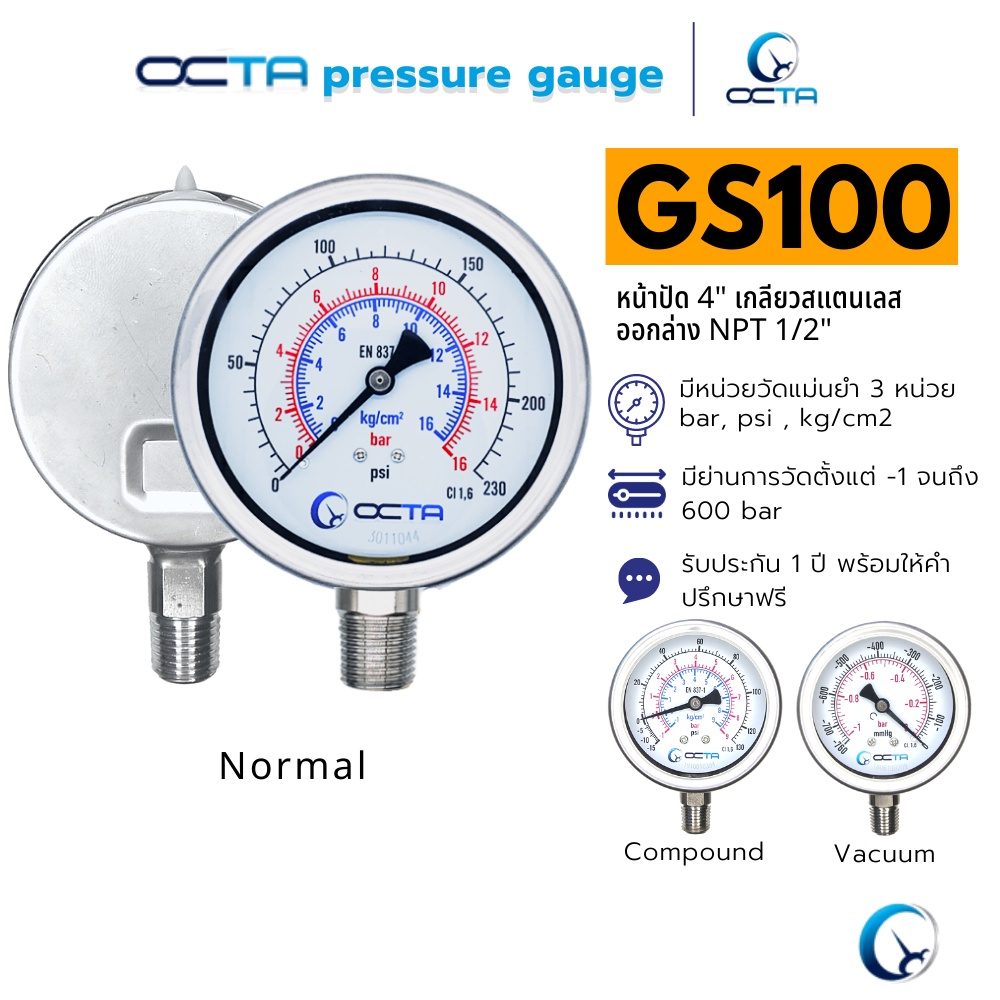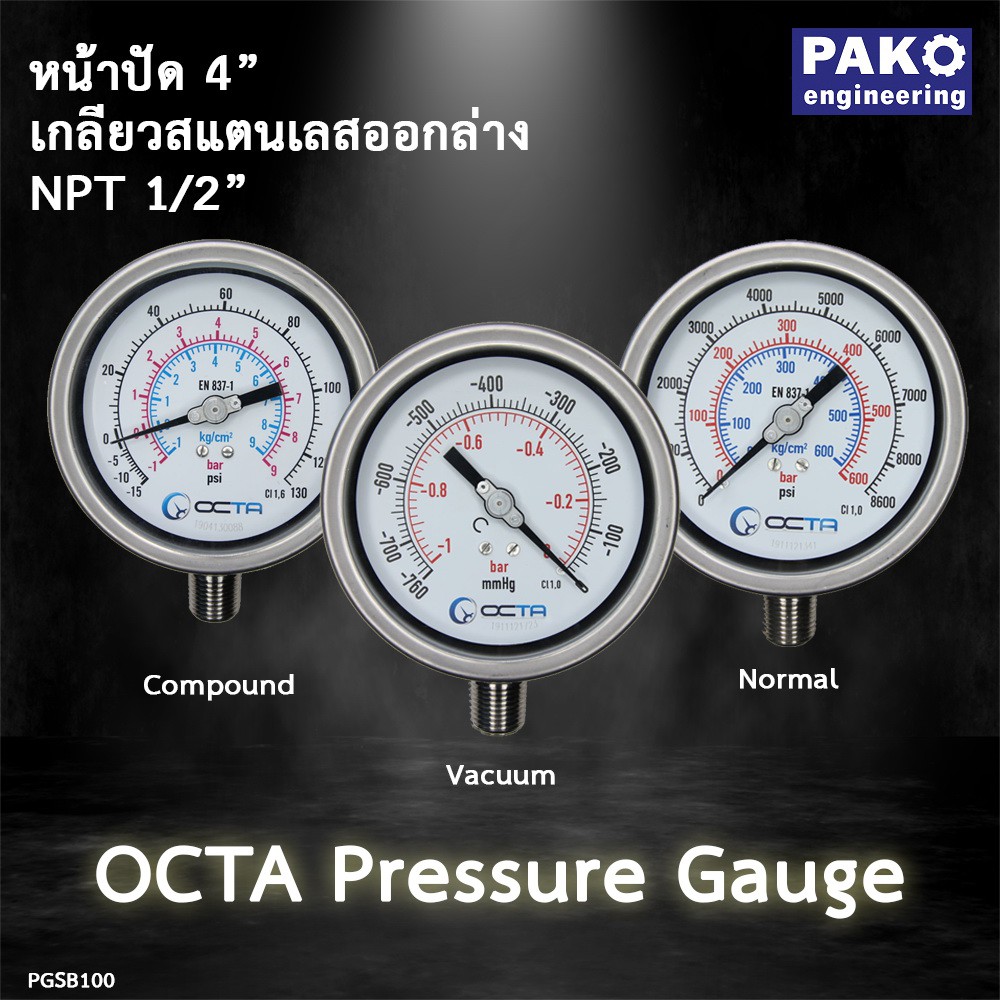 Pressure Gauge เกจวัดลม น้ำ สารเคมี ขนาด 4″ เกลียวสแตนเลสออกล่าง 1/2" NPT OCTA GS100 [ใบกำกับภาษี]