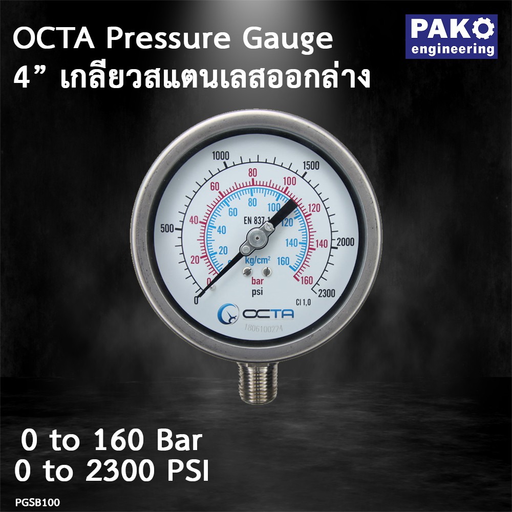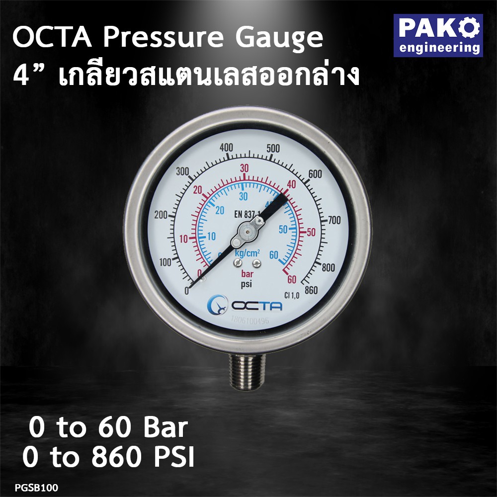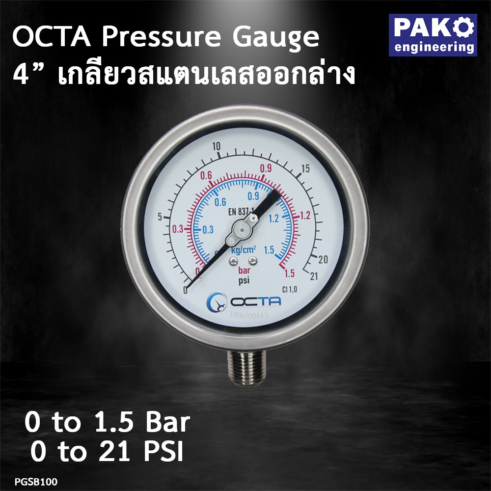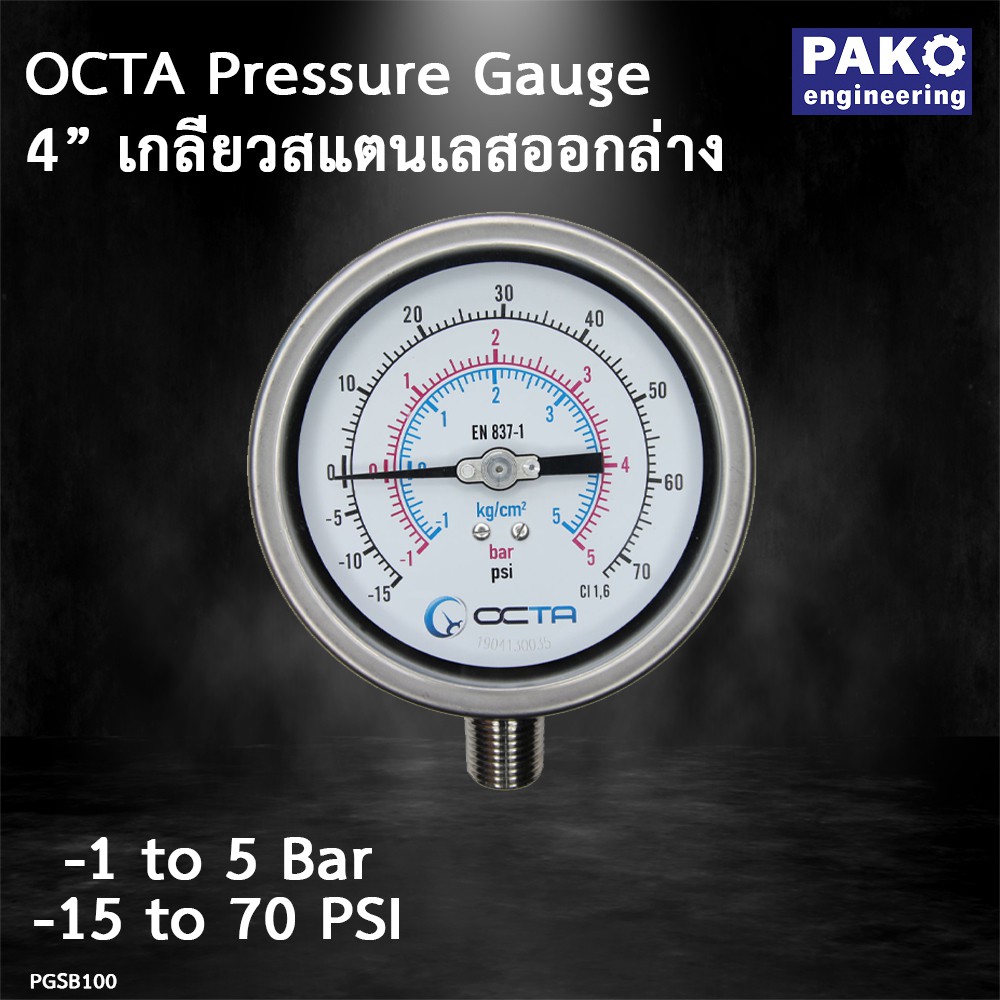 Pressure Gauge เกจวัดลม น้ำ สารเคมี ขนาด 4″ เกลียวสแตนเลสออกล่าง 1/2" NPT OCTA GS100 [ใบกำกับภาษี]