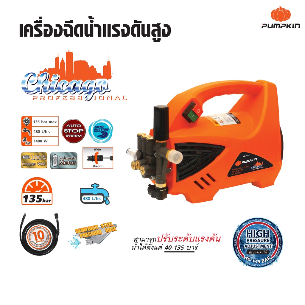 เครื่องฉีดน้ำแรงดันสูง (สูบน้ำจากถังได้ ปรับแรงดันได้) ยี่ห้อ PUMPKIN รุ่น CHICAGO 135 บาร์