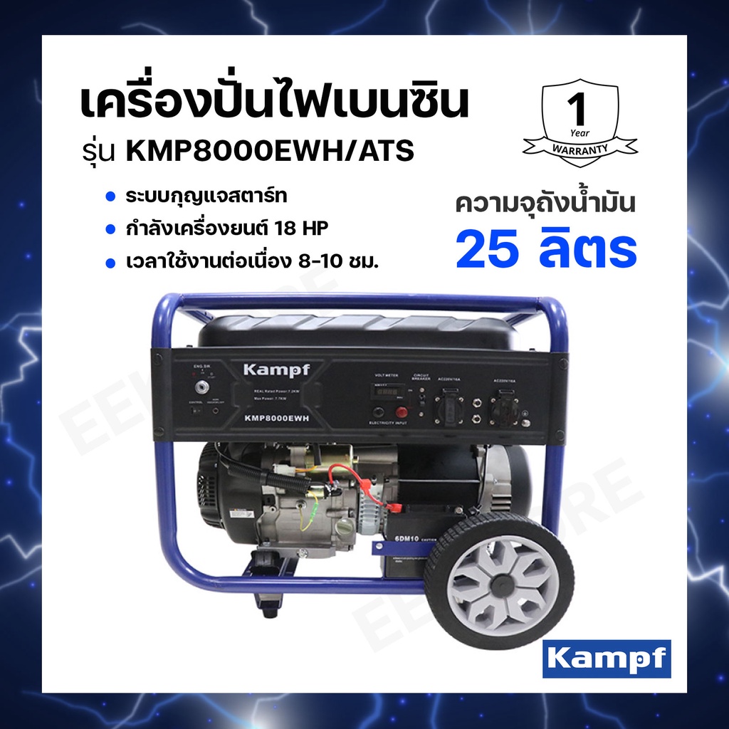 เครื่องปั่นไฟเบนซิน KAMPF รุ่น KMP-8000EWH/ATS 7.2 kW. กำลังเครื่องยนต์ 18 HP เวลาใช้งานต่อเนื่อง 8-10 ชม.