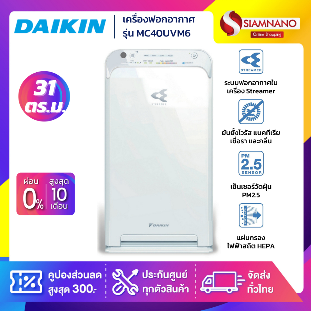 เครื่องฟอกอากาศ Daikin มีระบบ Streamer รุ่น MC40UVM6 ขนาด 31 ตร.ม. (รับประกันสินค้า 1 ปี)