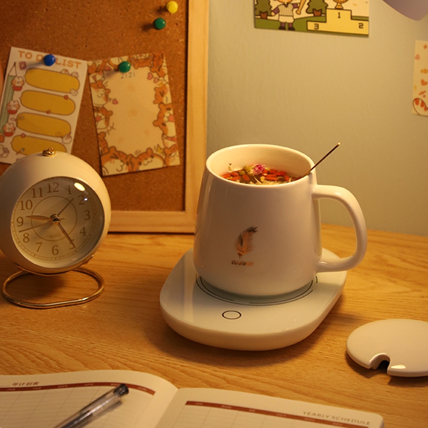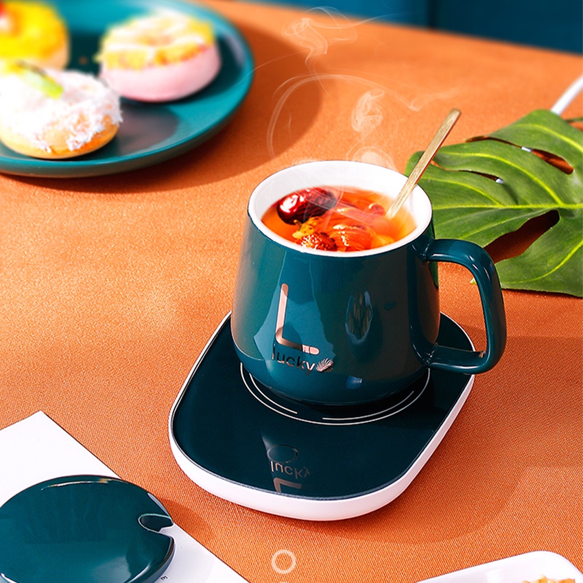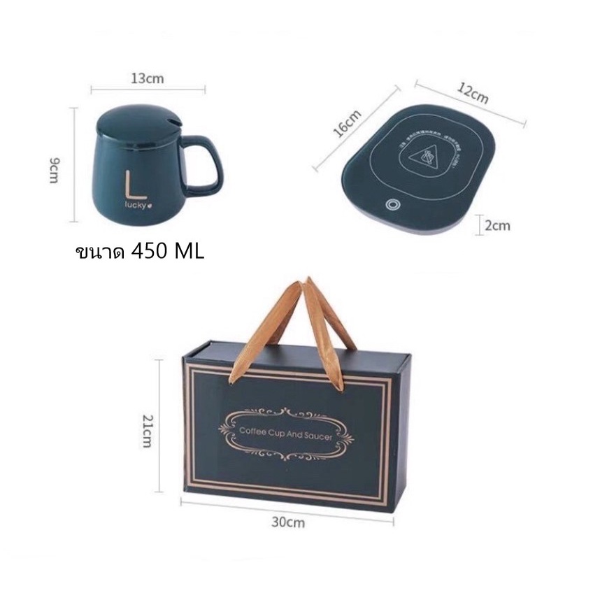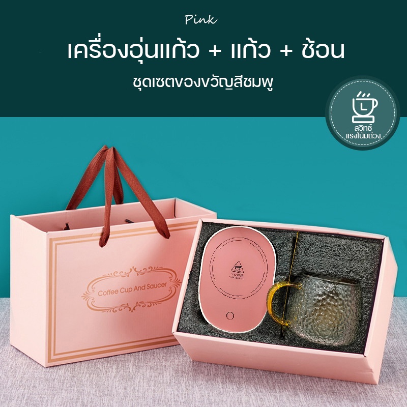 เครื่องอุ่นแก้ว พร้อมแก้ว+ฝา+ช้อน ชุดแก้วกาแฟ ของขวัญ เซ็ตอุ่นร้อน พร้อมเครื่องอุ่น