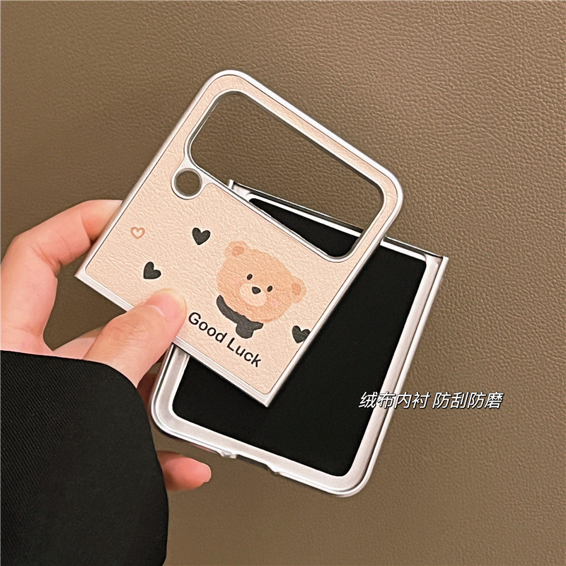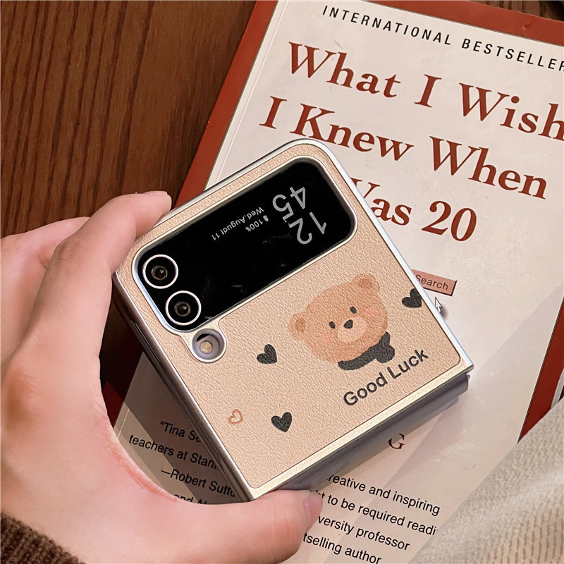 เคสโทรศัพท์มือถือหนังแกะ PC แข็ง กันกระแทก ลายหมีหัวใจน้อย พร้อมสายโซ่คล้อง สําหรับ Samsung Galaxy Z Flip 5/4/3/6 Cases