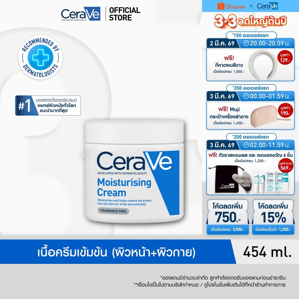 เซราวี CERAVE Moisturising Cream ครีมบำรุงผิวหน้าและผิวกายสำหรับผิวแห้งมาก 454g.(มอยเจอร์ไรเซอร์ Moisturising Cream ผิวช