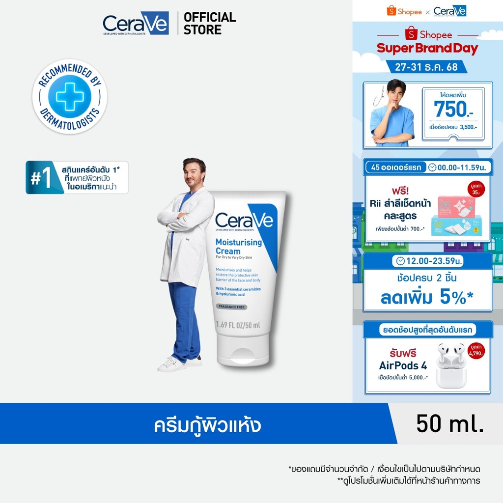 เซราวี CERAVE Moisturising Cream ครีมบำรุงผิวหน้าและผิวกาย สำหรับผิวแห้งมาก 50g