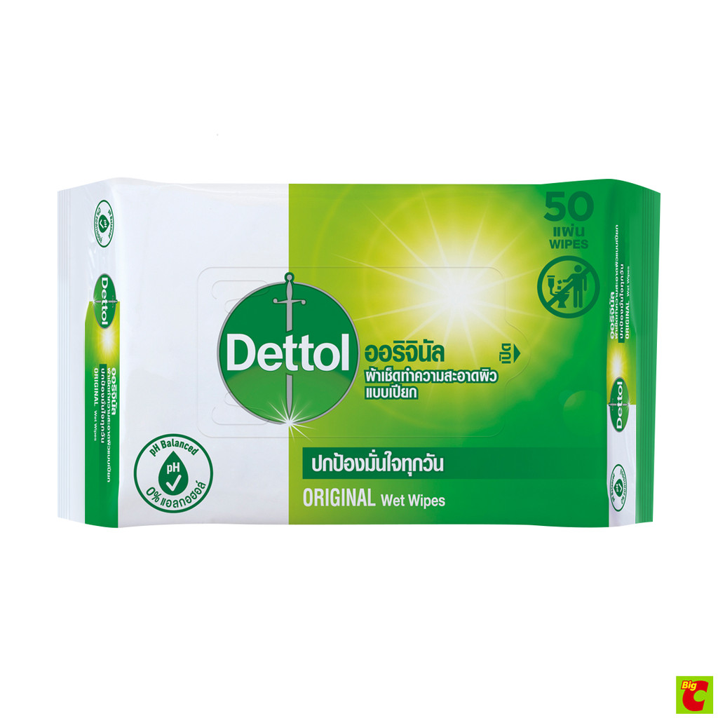 เดทตอล ผ้าเช็ดทำความสะอาดผิวแบบเปียก แอนตี้แบคทีเรีย ถุง 50 แผ่น