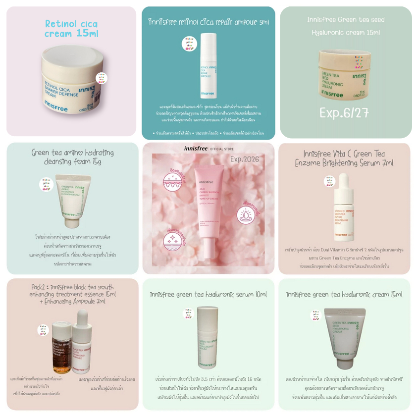 เทสเตอร์ Innisfree Green tea mask / Bija Cica / Cica Ampoule / Volcanic Pore / Clay mask / Foam / Hyaluronic serum
