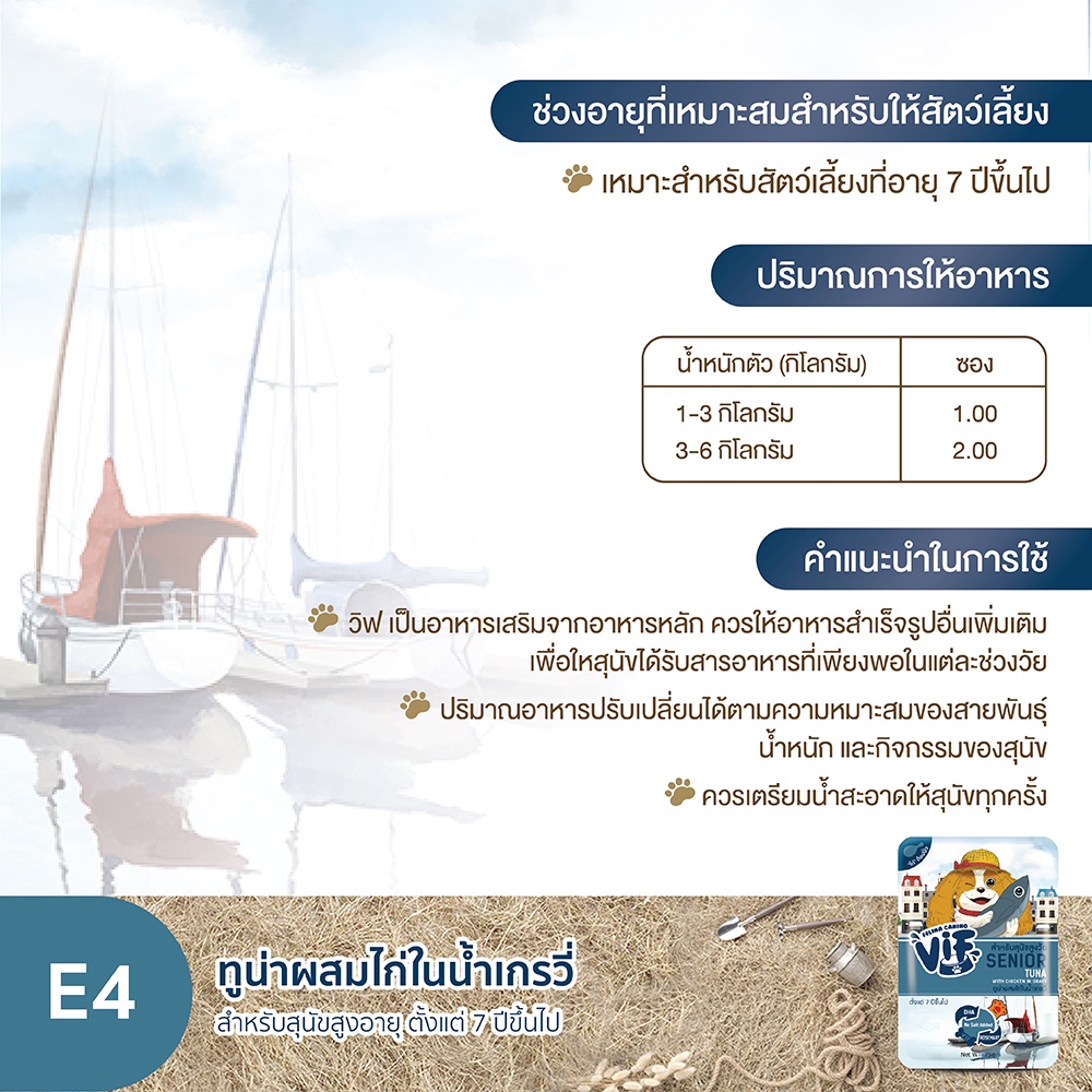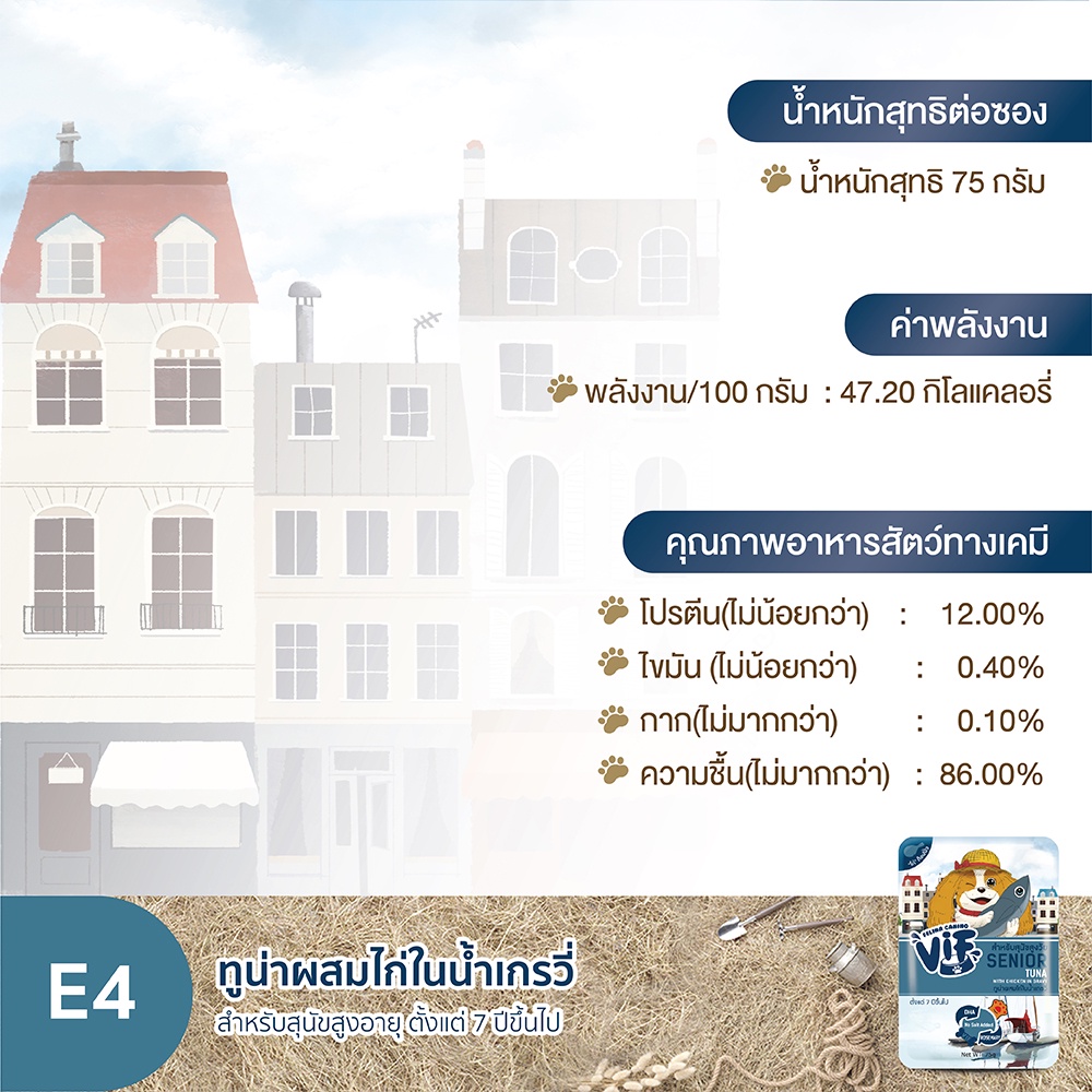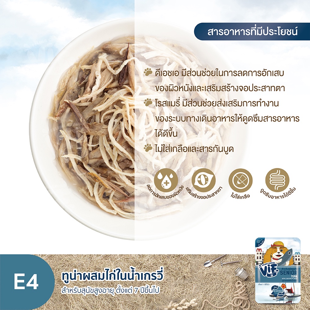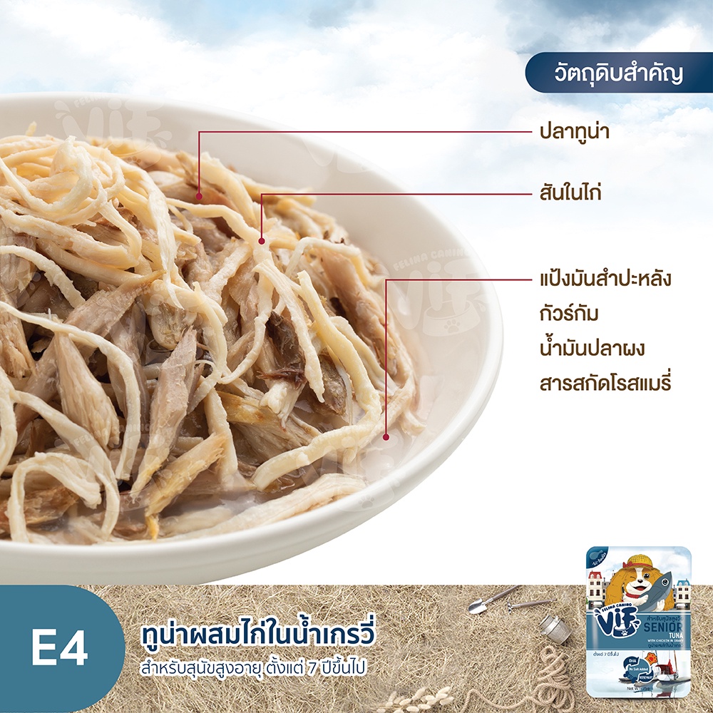 วิฟ (อาหารสำหรับสุนัข) : E4 ทูน่าผสมไก่ในน้ำเกรวี่ สูตรสำหรับสุนัขสูงวัย