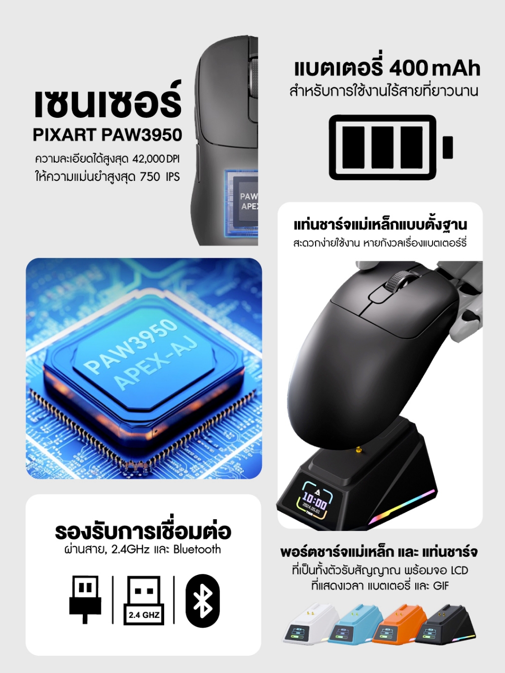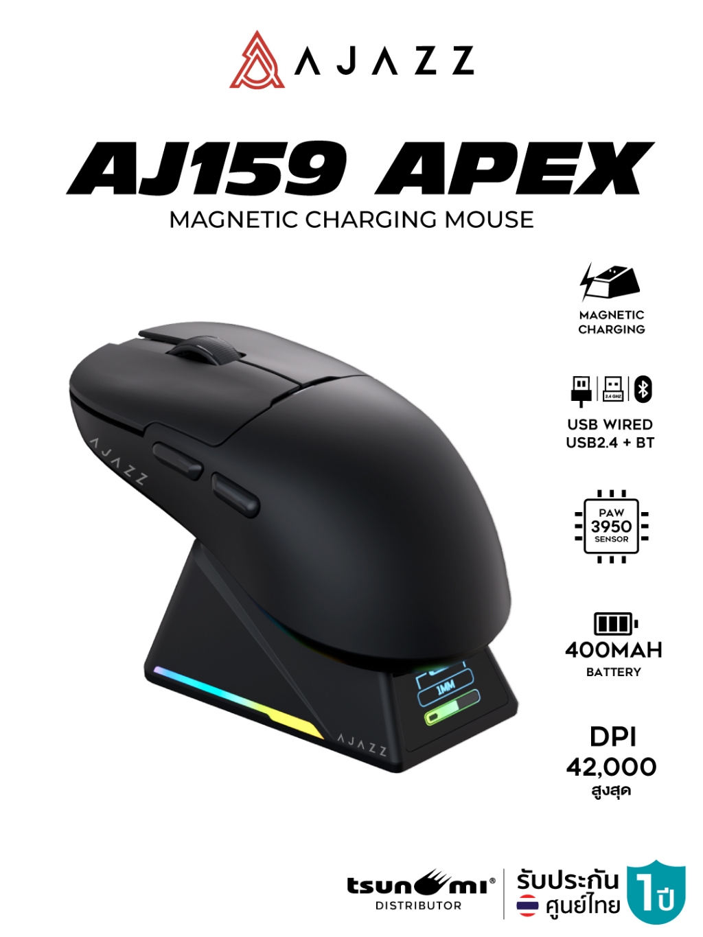 เมาส์เกมมิ่งพร้อมแท่นชาร์จ Ajazz AJ159 Apex 8K Tri-Mod Wireless Magnetic With Charginig Mouse รับประกันสินค้า 1 ปี