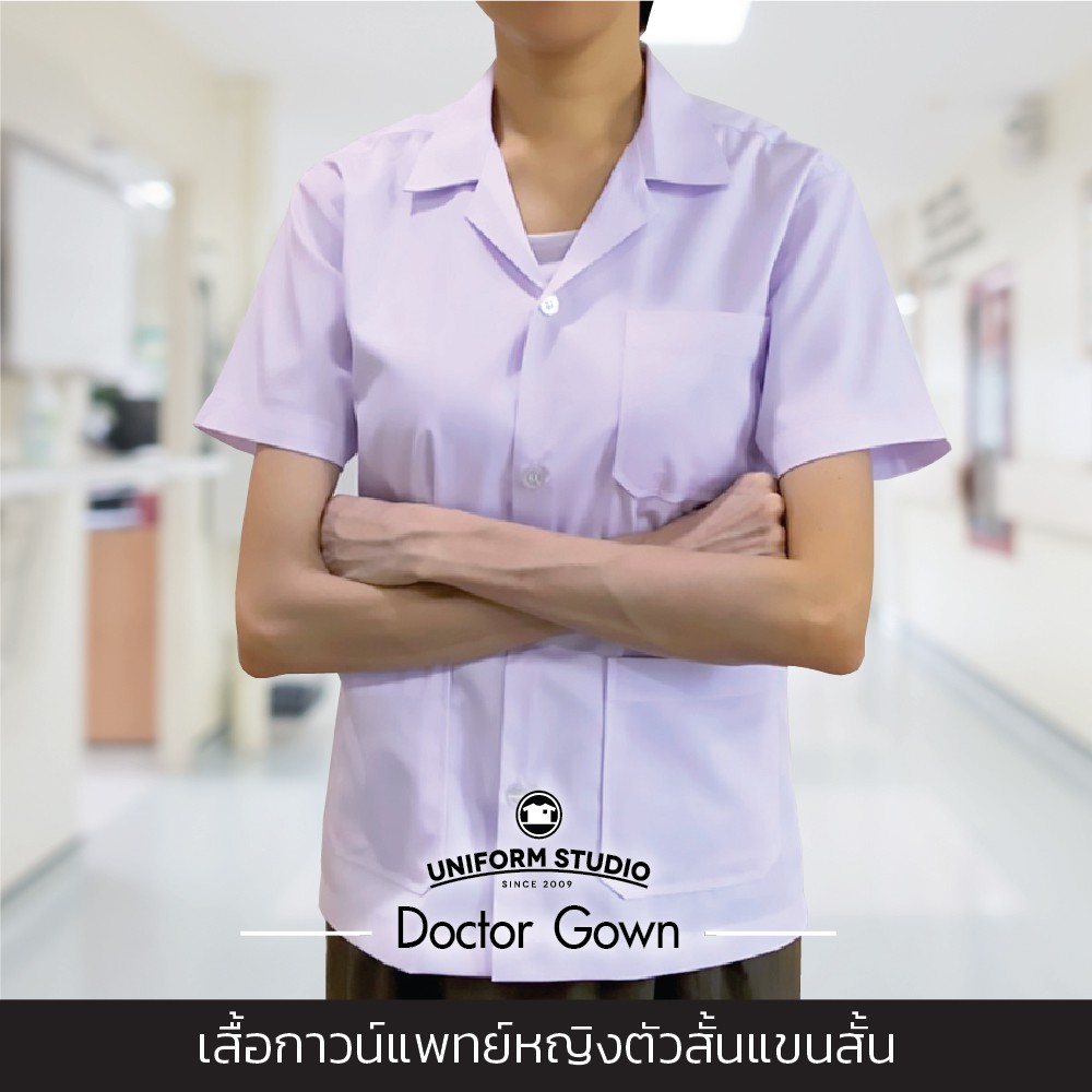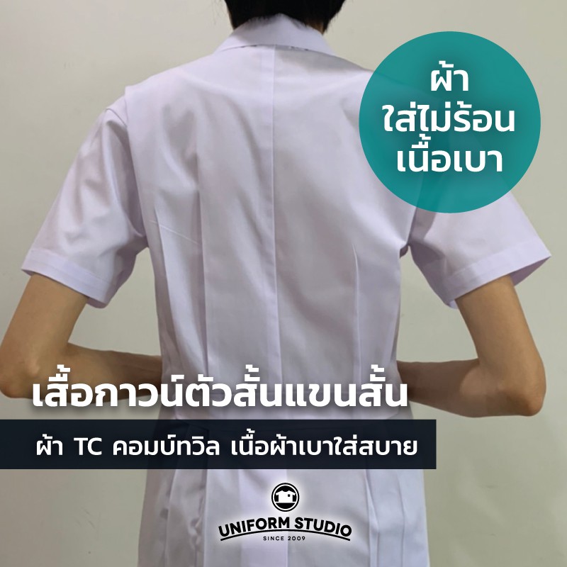 Uniform Studio เสื้อกาวน์ ตัวสั้น แขนสั้น ชาย หญิง เบาสบาย ไม่ร้อน เนื้อผ้าT/Cคอมบ์ทวิล