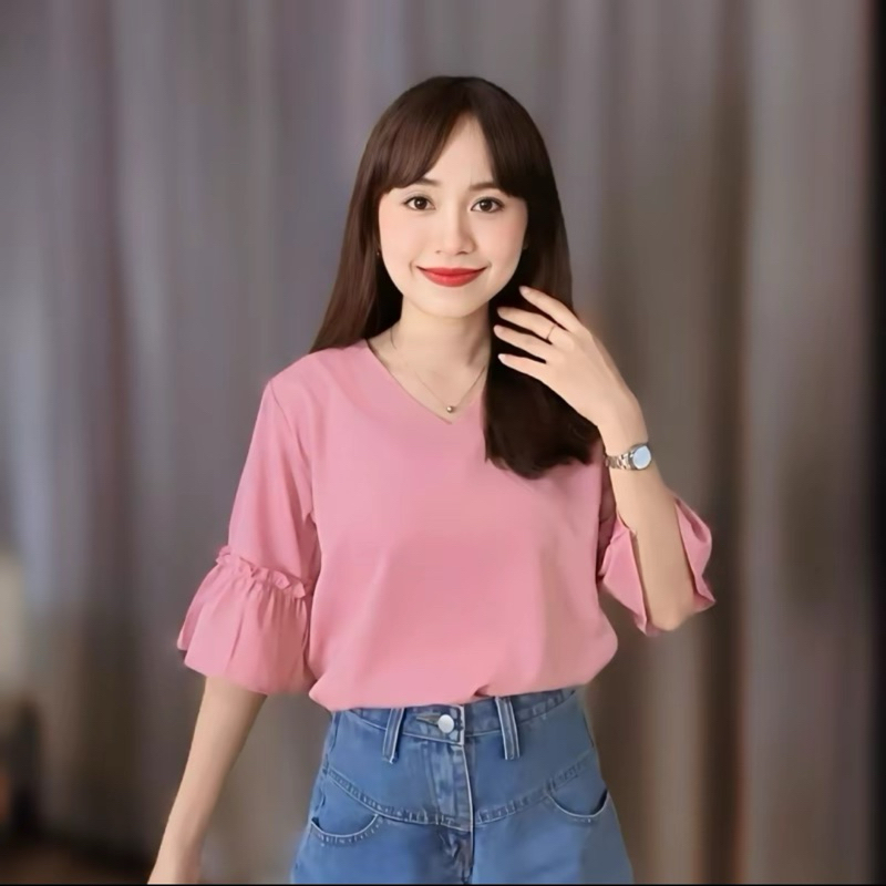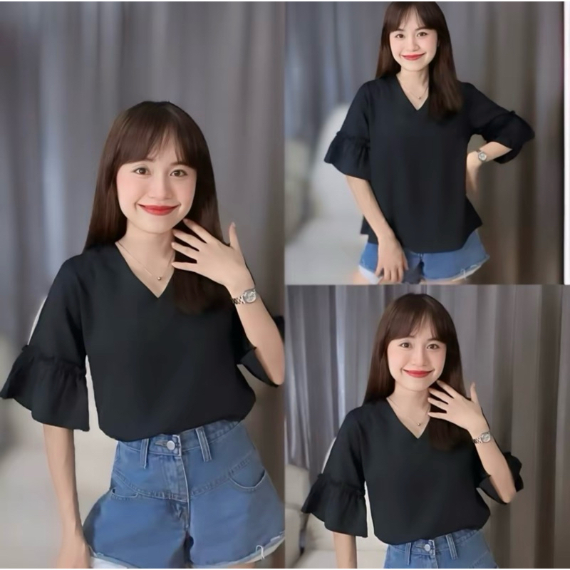 เสื้อคอวีแขนระบาย 3 ส่วน ลุคคุณ