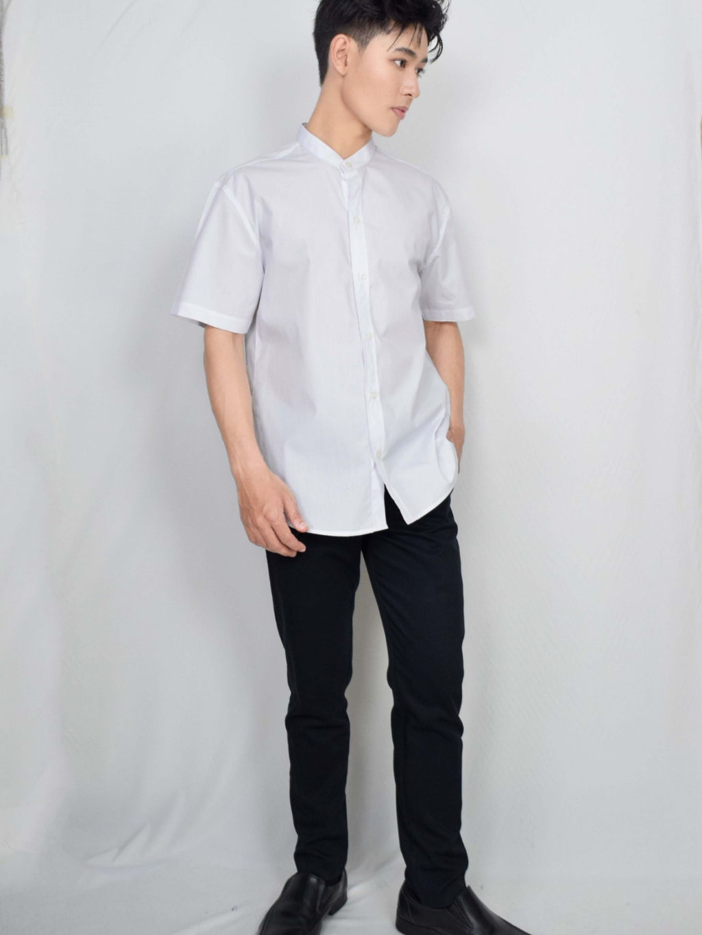 🚛🇹🇭 เสื้อเชิ้ตผู้ชายคอจีนแขนสั้น เสื้อเชิ้ตลำลอง ใส่ทำงานสมัครงานสัมภาษณ์งาน ผ้าอย่างดี ใส่หล่อเท่ห์